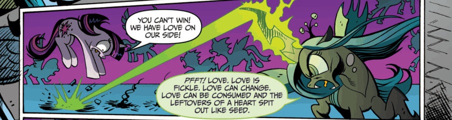 When reading it, there’s a clear sense in jealousy that she has for not only Celestia, but for the rest of pony kind.  Whether or not she’s biologically able to feel love, she doesn’t seem to have a clear grasp on why anyone would want to.  Despite the obvious (from her perspective) downsides of this emotion, she still remains powerless in the face of Celestia and the Mane 6.  Her species still remains on the outskirts of Equestria, while the ponies who continually break each other’s hearts and do stupid things in the name of love, have thrived.