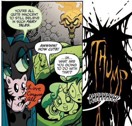 It’s an interesting corner that the writers wrote themselves into.  Maybe they never expected fans to care that much about the Changelings, but by leaving out some key details it’s hard to think of another outcome of the conflict.  Celestia was willing to give Discord a second chance, but how would she be able to give them one?  They are biologically designed to be parasites to all other living creatures, so letting them live can only pose a future threat.  They can easily manipulate others and, like traditional Changelings, they could surreptitiously put themselves into seats of power.  I don’t doubt that an easy solution can be pulled out of thin air (Tru Love, am I right?), but I’d rather have them either acknowledge the impossible scenario these two species are put into, or try and come up with an interesting solution for how they can coexist.  Despite all that, I have a feeling she’ll reappear in the show at some point in a role similar to the one we saw in the comic arc.  They aren’t going to go into the issues I’ve described, but it’ll still be fun to see her again.  Because of this, reformation seems unlikely which I think is for the best since we need at least ONE villain who can reappear on a regular basis!  Whatever they decide to do with her, there’ll always be a soft spot within the fandom for the best evil queen in Equestria.