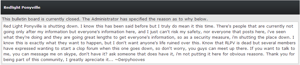 This leads us inevitably to Cloppers. As far as I’m concerned, the clop community is completely harmless and should be accepted as much as any adult community within a specific fandom. Anyone claiming that they are doing some sort of harm or are worthy of scorn are just bullies looking for someone they can harass with impunity. If you’ll indulge me for a second, which of these is the bigger threat: A private website that Cloppers can get together, role play, and share pictures (among other such actives), or the hackers who threatened to release all the members’ private information if the site isn’t shut down?