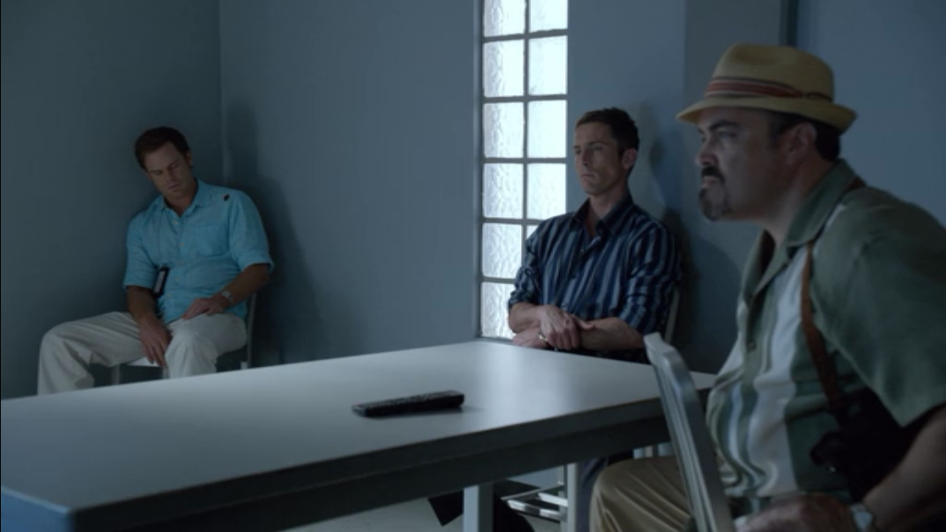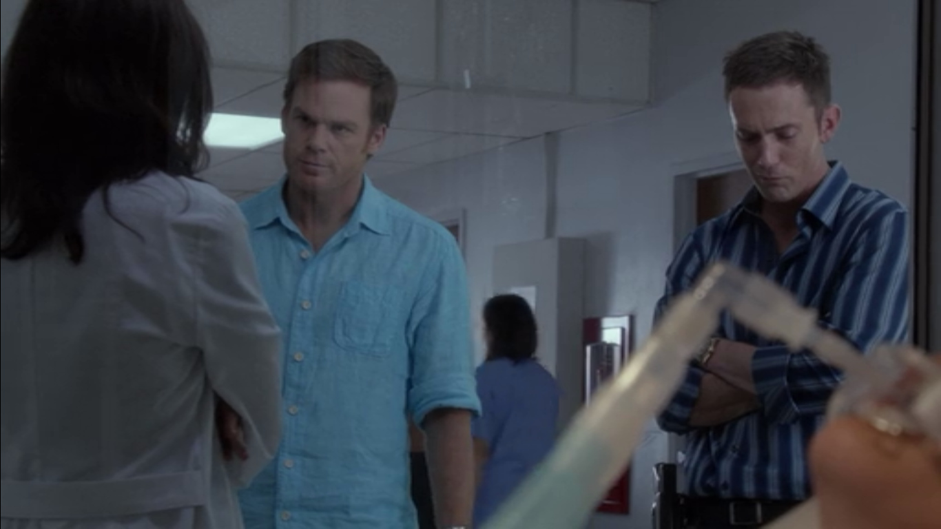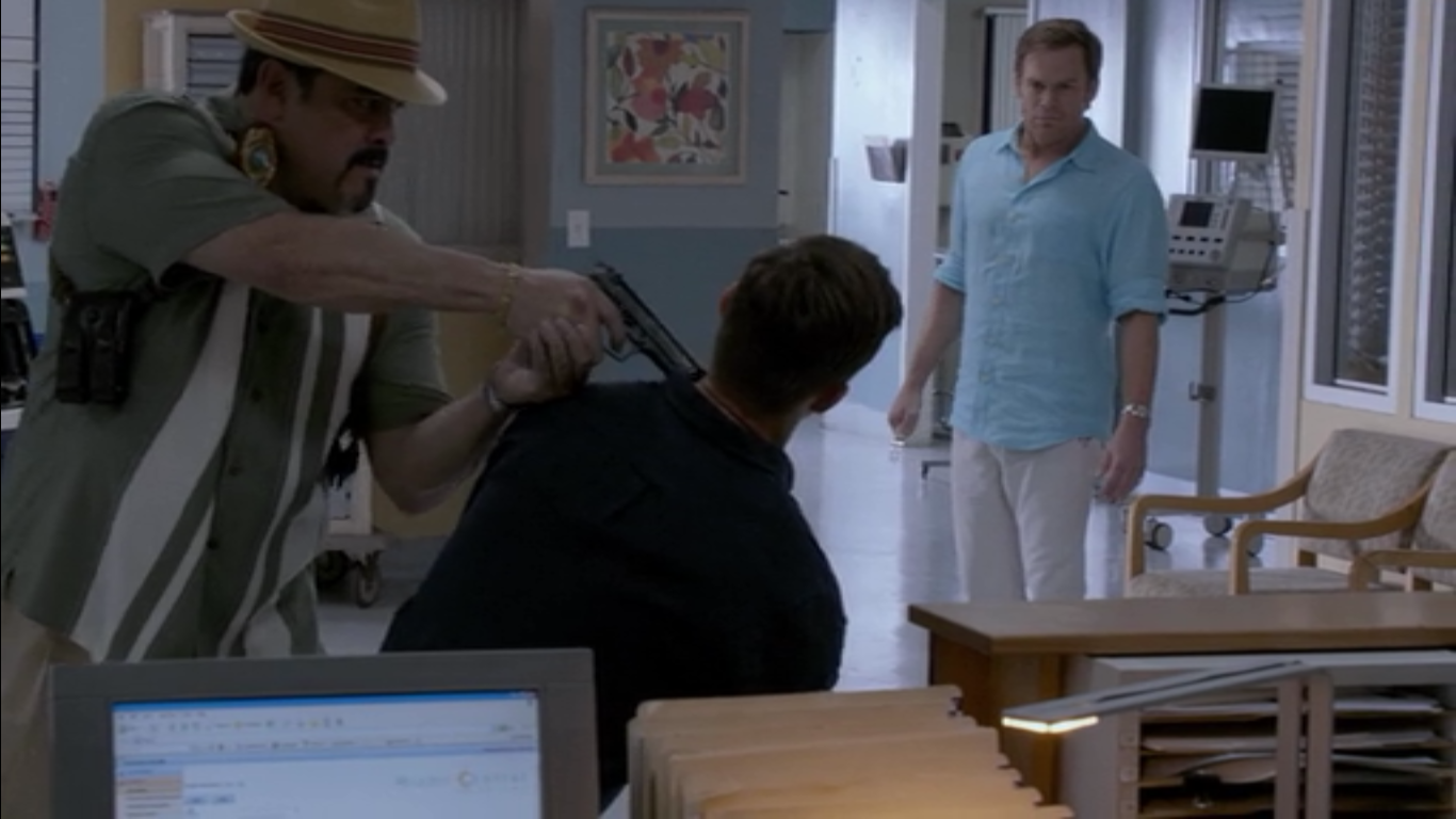 Dexter gets hauled into the Miami Metro Police Department, and is put under arrest for murder. Oh wait, that’s not what happens. Two people he’s worked with for years watch the surveillance footage, declare it self-defense, and TELL DEXTER TO GO TO ARGENTINA!!!!