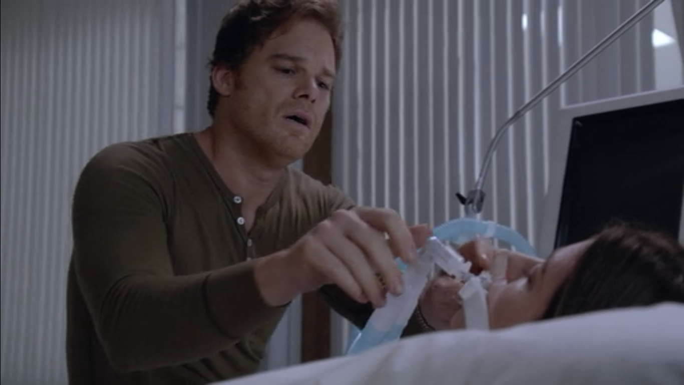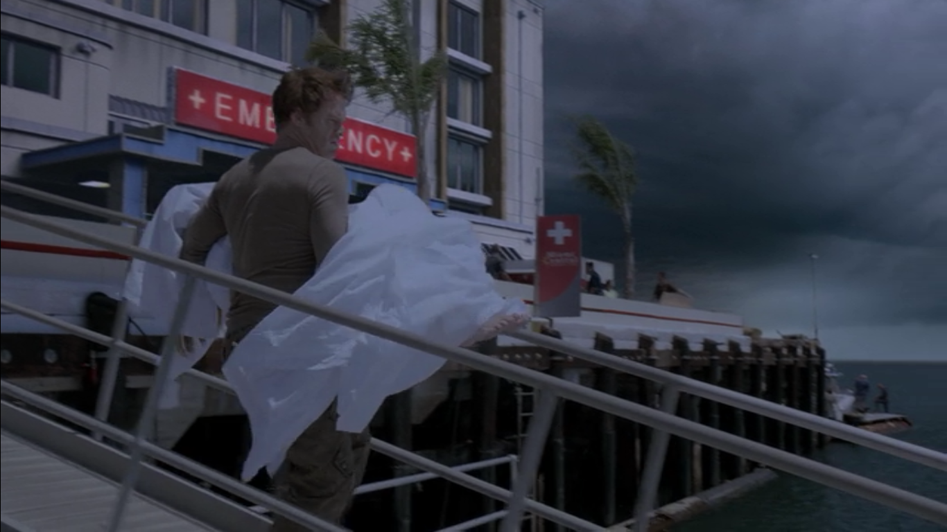 Holy fucking shit. How fucked up does this look? You just gave a free pass to a dude who’s worked there for years. How the hell do you have jurisdiction on this case!? Conflict of interest!!! And the icing on the cake is the fact that the police just told him to flee the country. Holy shit, is this thing over yet? I don’t think Miami Metro could get any more incompetent without turning it into a part time strip club. Anyway, Dexter goes back to the hospital, walks right into Debra’s room, has a moment before pulling the plug, and then walks out with her dead body without anyone noticing him or stopping him. Oh, a hurricane is coming, and they are moving patients. Ok, fine. I might be able to buy it except for the fact that he’s clearly not taking the body to any of the emergency vehicles, and instead is taking it to his boat. Wait, since when are hospitals on fucking boardwalks?