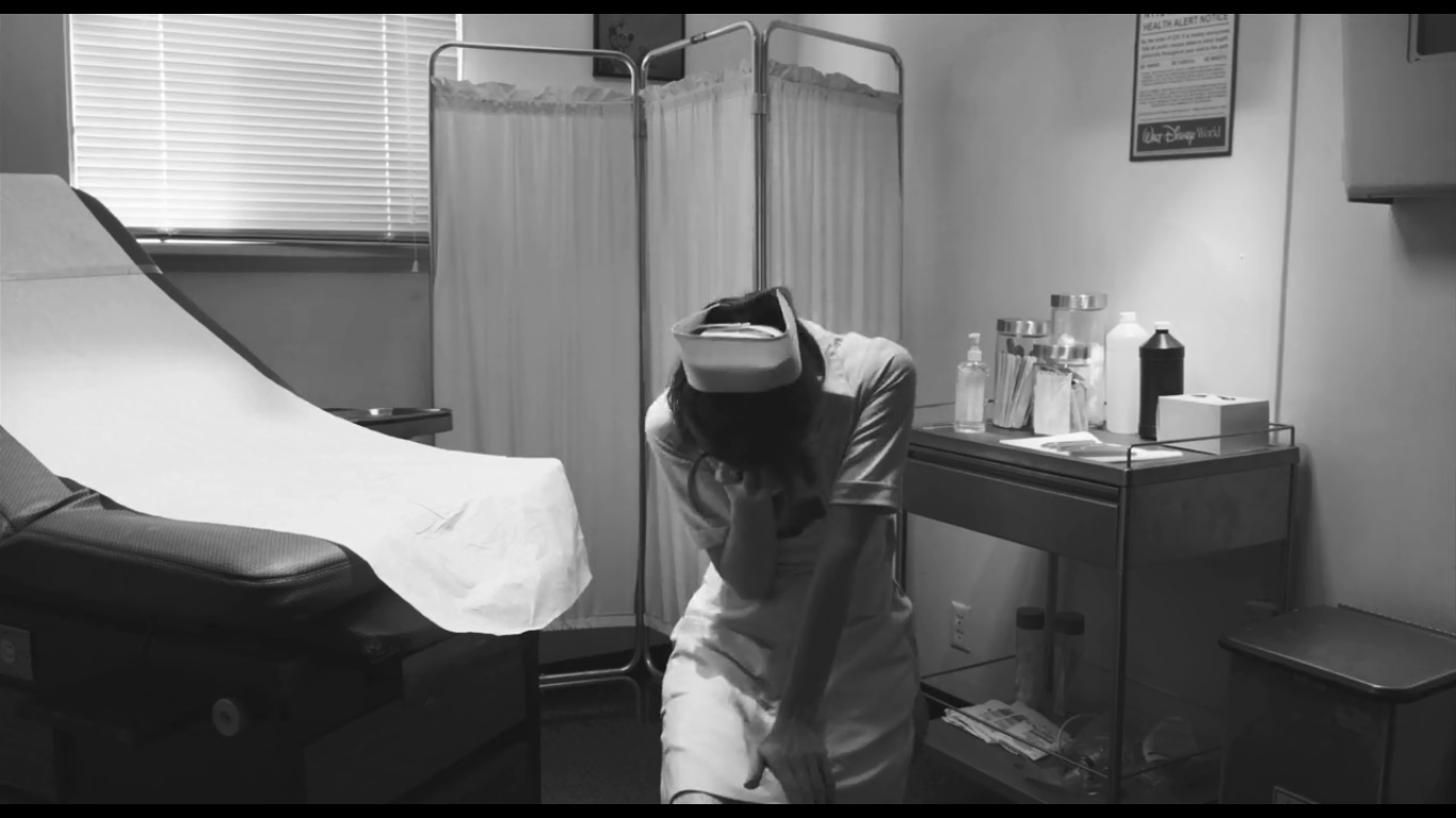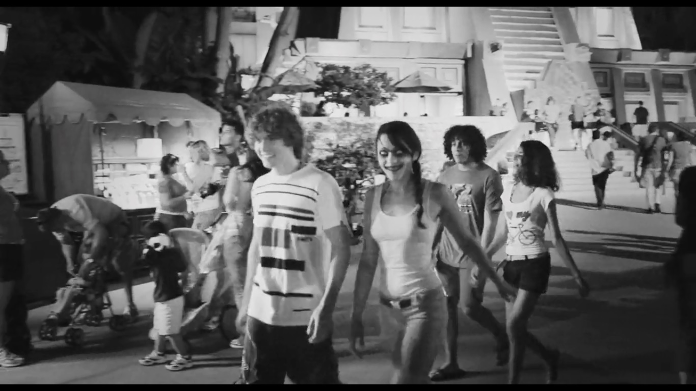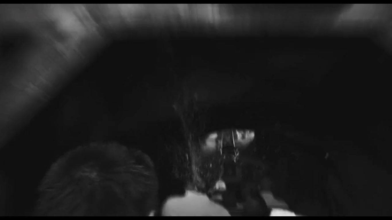 Right off the bat, this movie is letting you know that it’s not fucking around. After the decapitation, we meet our hero Jim who’s finding out that he’s been fired. It’s the last day of the family’s vacation at Disney World, and he decides to not spoil it by telling them what happened. The limitations of the production become apparent (LOTS of ambient audio) but for my money, it’s worth it to get that extra layer of authenticity. Watching two French teenagers sing while dancing around a pole in the actual Disney World monorail is definitely more interesting than if it was on some made up amusement park. Oh yeah, there’s French twins dancing around poles in this. They are obviously going for a David Lynch level of absurdity which is very much appreciated. After the monorail ride, we get a few minutes of them going on the various attractions in the park. It’s actually quite remarkable how the cinematography combined with the music and black and white filter can lend an extra level of absurd creepiness to rides that are intended for children. As these scenes continue, the rides start to become more distorted which I’m guessing is supposed to represent Jim’s mental state slowly deteriorating. As much as I like this, I must admit that it ramps up a bit too fast at one point where his wife starts mocking him.
