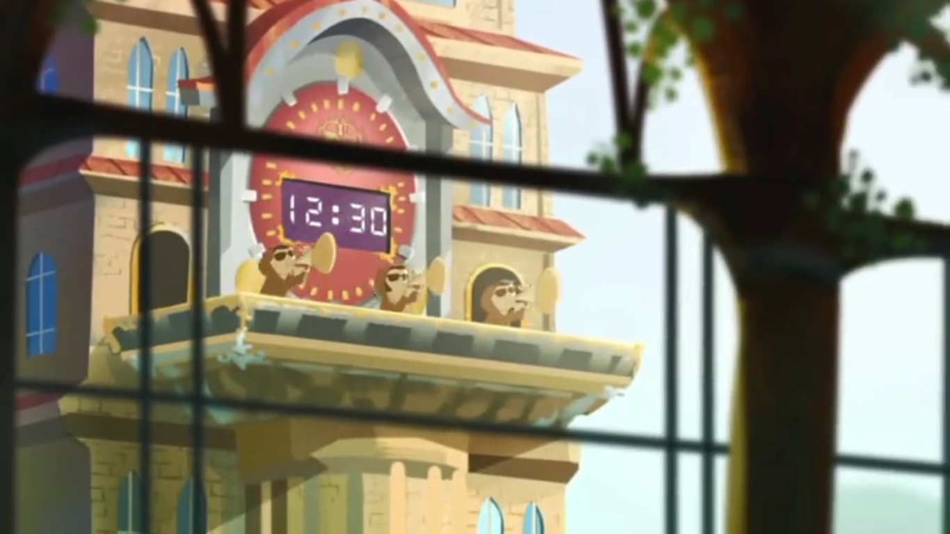 You know what? I’m not even going to criticize them for doing this. It’s a simple enough character template and anything that could liven this up a bit is very much appreciated. So Raven is having an identity crisis because everyone assumes that she’s evil like her mother. Our offbeat friend here (Madeline Hatter) assures Raven that everyone is cool with her, and then they walk into the school where EVERY LAST MOTHERFUCKER THERE looks at her, screams, and runs 40 miles in the opposite direction. Is this something that happens every day!? What the hell is this shit!? Madeline, despite seeming everyone shit their pants and bolt, still seems assured that everyone likes Raven and proceeds to act quirky. We cut to lunchtime which we know is at 12:30 because we see the olde timey clock tower has a digital clock embedded into it.