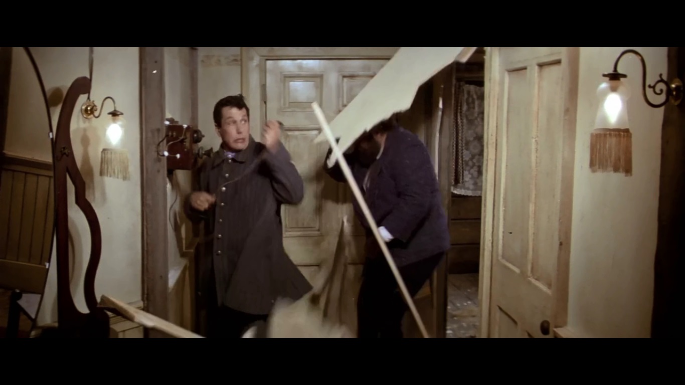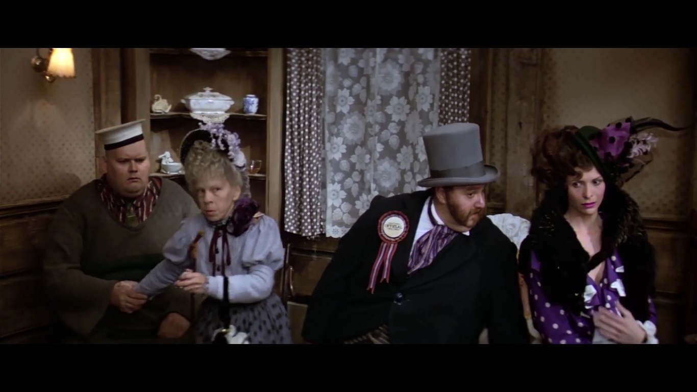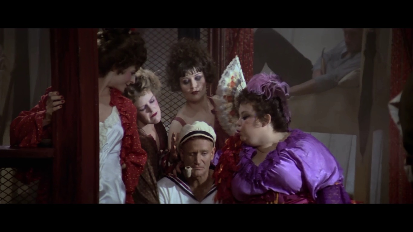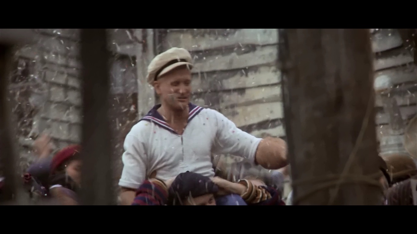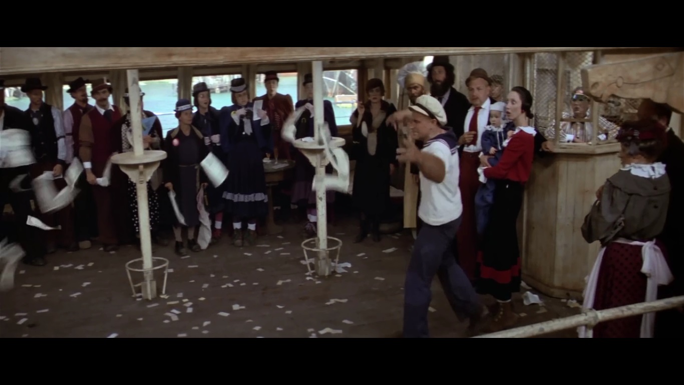Later that night, there seems to be an engagement party for Bluto at the Oyl’s house, which is odd considering that Olive decided not to marry him. Why still have the party, and then tell him AT the party that the engagement is off? Wouldn’t it be better to tell him someplace where you don’t keep all your stuff? Popeye makes it to the party and sticks out like a sore thumb to the point that every last person attending gives him the stink eye and the silent treatment. Feeling dejected, Popeye leaves and wanders the town, mumbling to himself the entire time. We cut to Olive who’s getting dressed for the party, but is actually trying to pack her suitcase without the other girls there noticing. Why didn’t she pack yesterday!? Or even an hour ago!? When she finishes packing she runs away as fast as possible, leaving her family and friends to deal with the behemoth with a bad temper when he finds out that she split. The actor playing Bluto is Paul Smith, and he’s fantastic as the character. He’s a bit more… monosyllabic than Bluto was in the cartoons, but the combination of his intimidating performance and the performance of everyone around him creates a memorable character that’s both scary and hilarious.