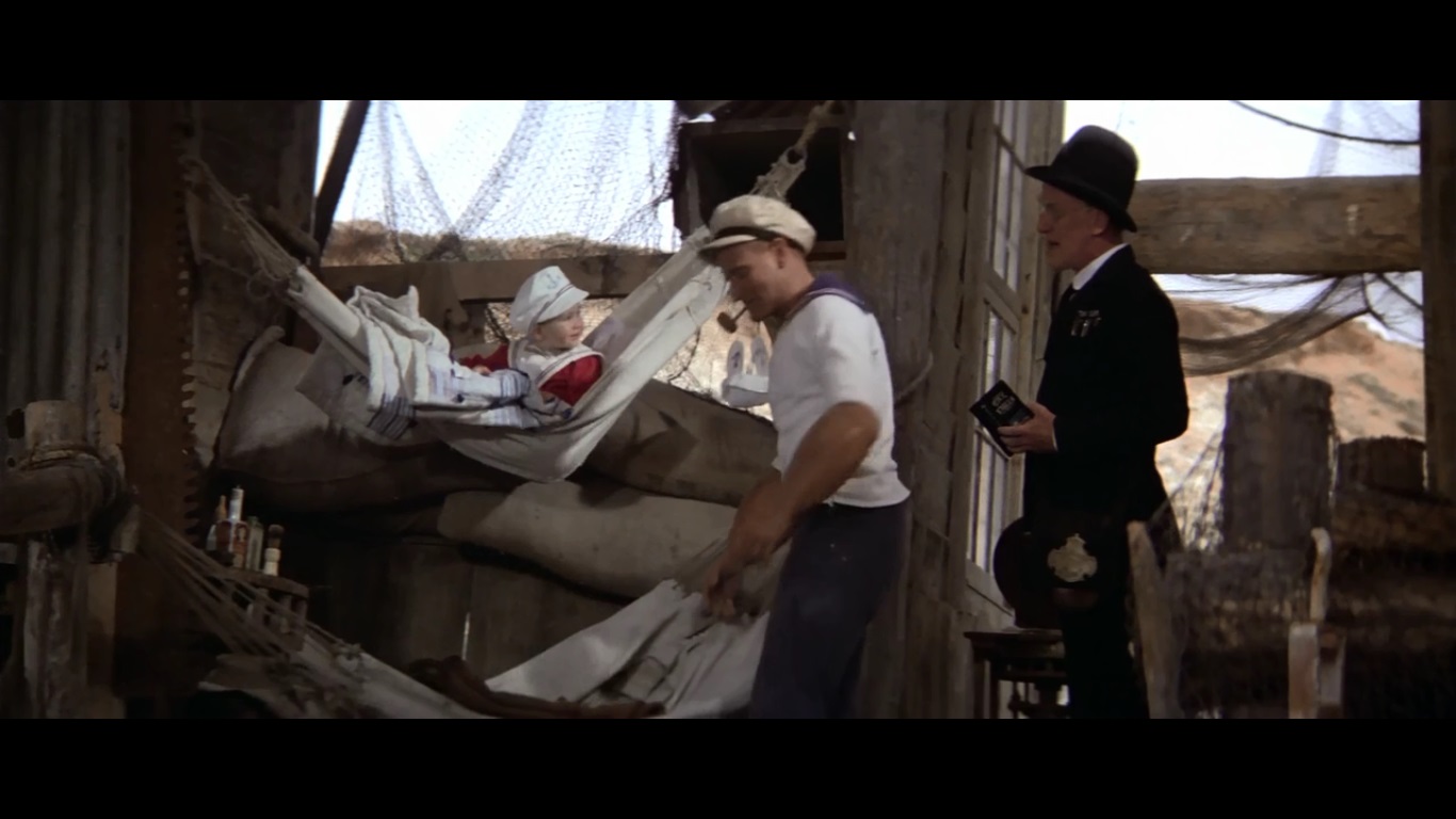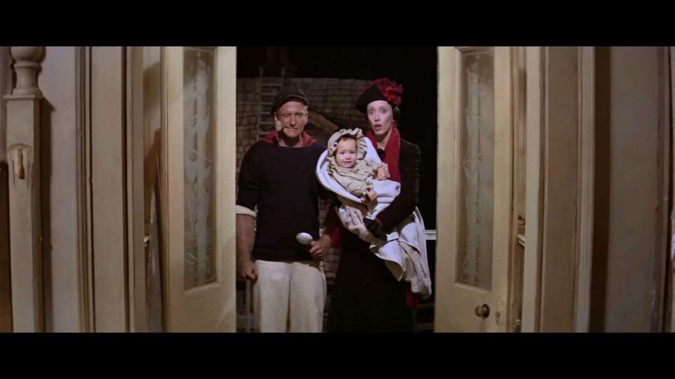 After the fight, Popeye and Olive bond while taking care of the baby Sweet Pea in a scene that’s pretty nice. Shelly Duvall and Robin Williams do a little lullaby duet that’s genuinely heartfelt and sweet. The next morning though, reality continues to rear its ugly head with the fact that the house is still half destroyed, and the tax man is breathing down their necks. Olive and Popeye are trying to make the most of what’s left, and Olive has apparently noticed that Sweet Pea can predict the future.