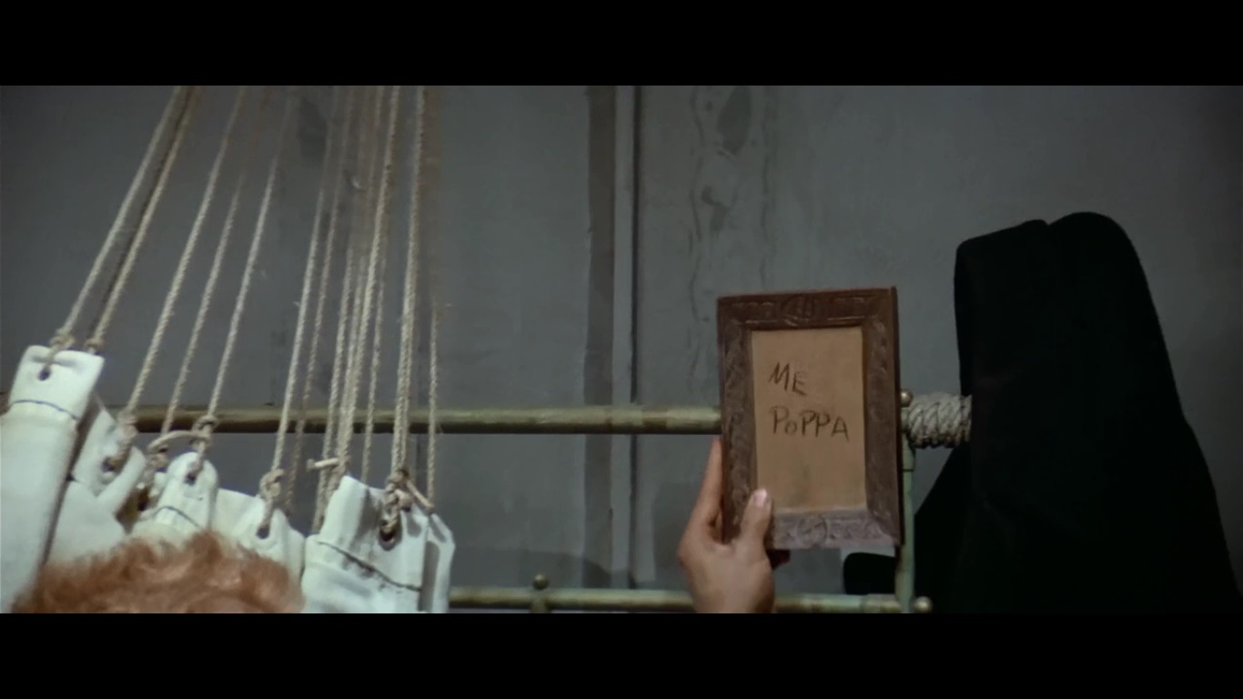 Instead of looking for the baby, Popeye just sulks long into the night. Olive Oyl overhears him talking about how much he’s screwed up and how much he needed Olive, which leads to her sneaking away and singing a song all the way home. It’s like most of the songs in this (overly simplistic) but it doesn’t have the benefit of lots of slapstick going on while the song is being sung. That said, Shelly Duvall is the best singer by far, so it ends up sounding better than most. The next song however doesn’t work too well as we see Popeye pining for Sweet Pea (again) only this time in song and with copious use of flashbacks. There’s a decent joke here where Popeye is writing a message and placing it in a baby bottle, but the scene still feels a bit pointless. The next morning, Olive overhears Wimpy talking about Sweet Pea, and gets him to confess to what he did. We then cut to Bluto and Sweet Pea who are in the Commodore’s boat, and it turns out that he is in fact… POPEYE’S POPPA!!!!
