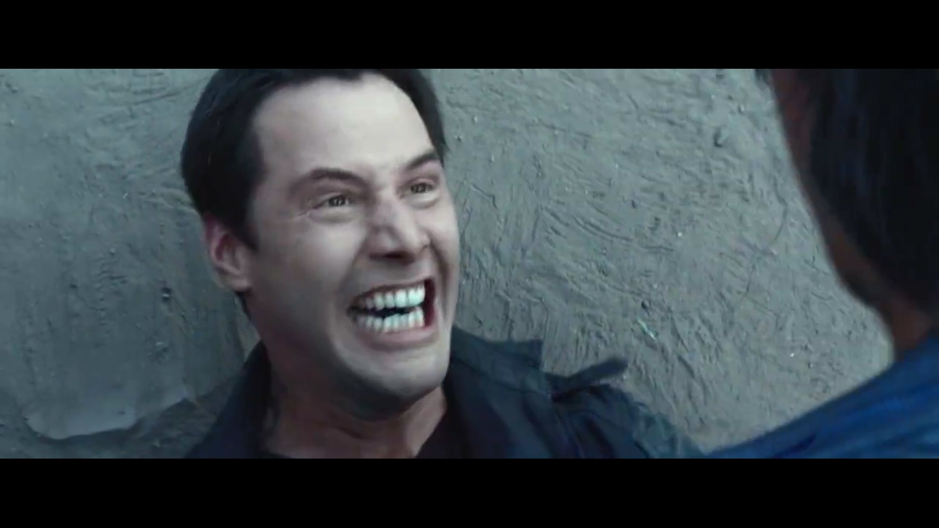 The cops finally bust in, but unsurprisingly they’re either at the wrong place, or they got there too late. We cut back to the gimp who turns out to be Mr. Reeves himself, and he goes to the locker room where the winner is changing after the fight. Neo asks him what happened out there and gives the guy about four seconds to answer before stabbing him fifty times in the stomach. Wait WHAT!?