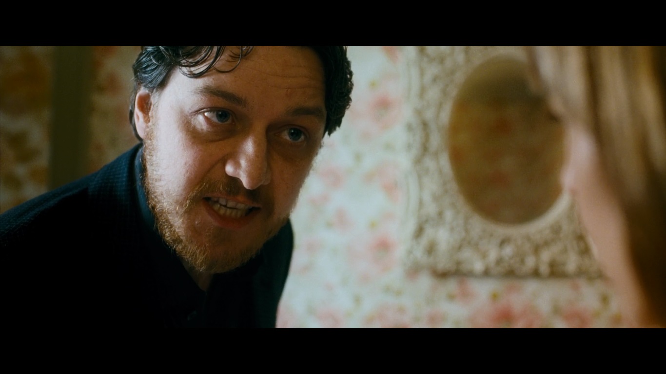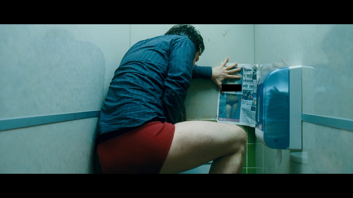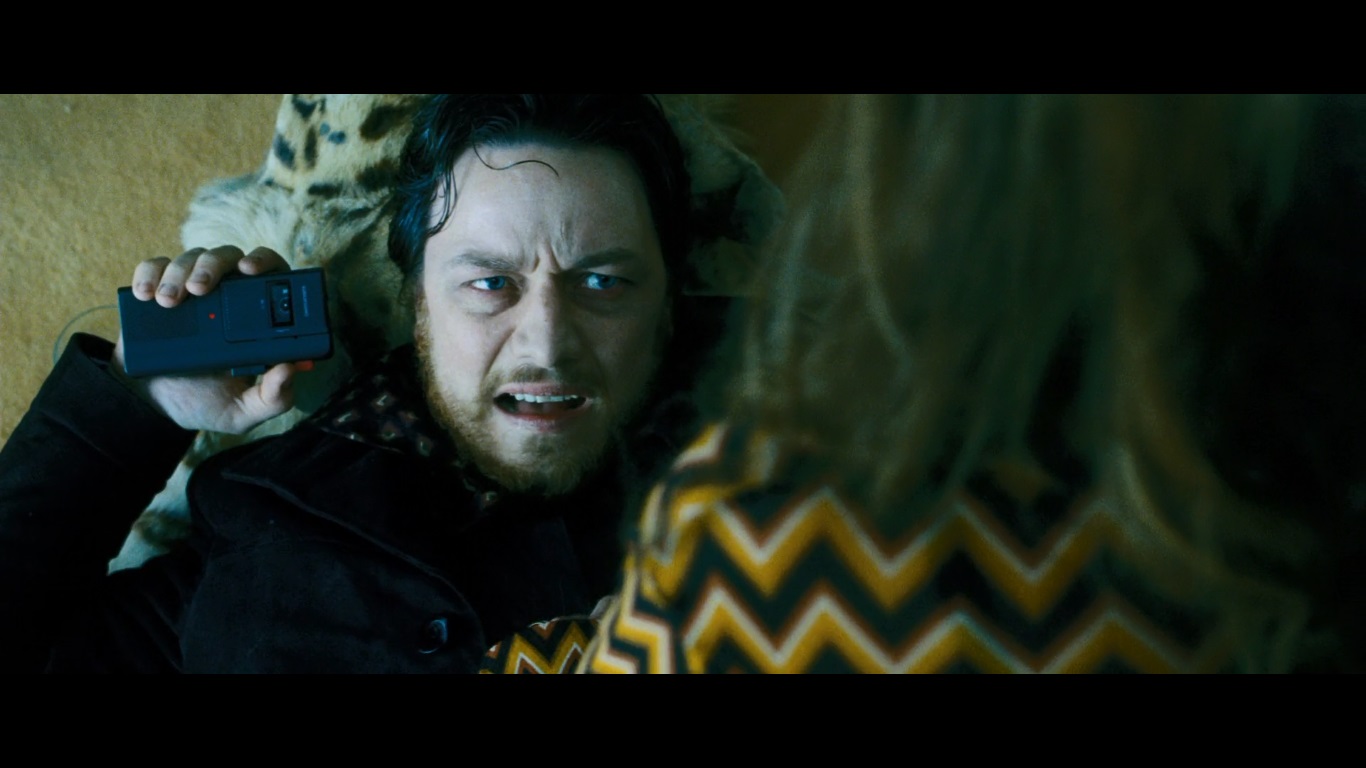 Aside from the presence of Jim Broadbent, the scene is pretty uninteresting. The doctor isn’t specific about what Bruce is there for, so we don’t get any further insight into the nature of Bruce’s insanity. We go from there to a scene of James McAvoy jerking off to porn (something I could have gone my whole life without seeing) and after finishing watches a program called “The Frank Sidebottom Fantastic Shed Show.”