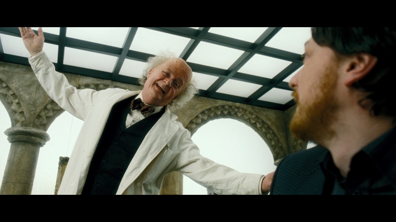 The woman seems to recognize him despite Bruce not recognizing her (either foreshadowing or standard course for our chemically enhanced hero) and ends up giving him some info about one of her associates after Bruce threatens to rape her. Having a lead to go on, he exits the store and IMMEDIATELY runs into the widow of the man who he couldn’t save the other day. They have an awkward talk and seem to hit it off (not really in a romantic way) before Bruce loses his nerve and bolts. We then cut to him at home taking his pills and hallucinating things. We get an amazing fucking sequence of Bruce inside his own head where he’s talking to Jim Broadbent who looks like an even crazier Larry Fine.