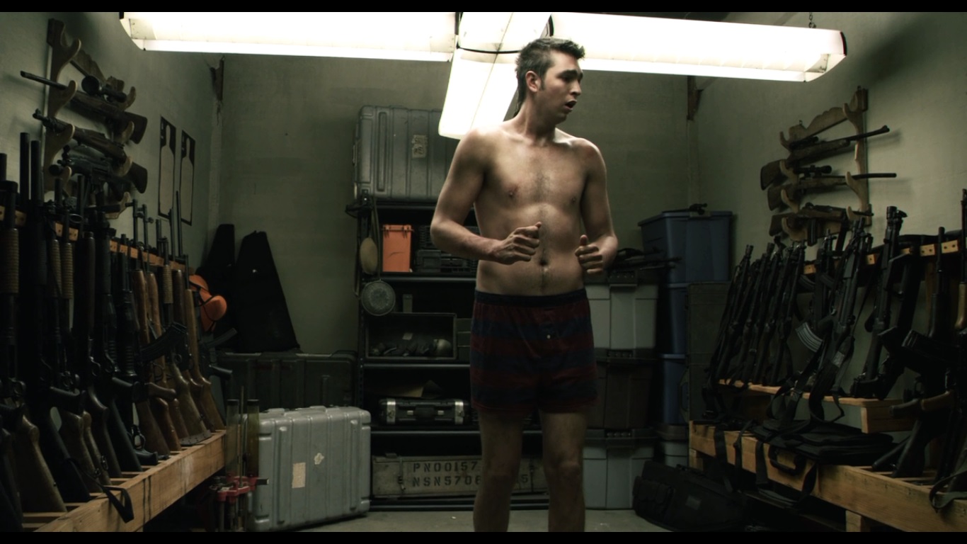 They start taping him up to the cross and the movie thankfully cuts to something else before they get much further. What we cut to isn’t THAT much better though because it’s Travis and Billy-Ray freaking out and trying to find a way to escape. Fortunately for them, the man who was thrown down there broke one of his bones and it’s poking out of the skin. Travis tries to cut through the plastic sheeting with the sharp piece of bone, and is also trying to keep Billy-Ray from completely losing it. At the same time, the deputy is knocking on the church gates and Abin goes out to turn him around. Travis is able to free Billy-Ray, but Billy-Ray bolts before Travis can cut through his own restraints. The church goers hear the commotion and one of them (with a gun) goes to investigate. Billy-Ray is desperately trying to find a way out and ends up in a room that is filled to the brim with weapons.