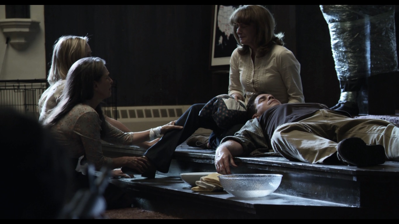 Throughout the sermon, you can see a sheet covering something in front of the cross. Considering the fact that they’ve got a kid in a cage next to the pews, you can only image what’s under there. They wait until after the sermon to reveal what’s underneath, allowing your imagination to run wild which is actually quite effective. Once they do remove the sheet, it turns out to be a man they tricked with an online ad for gay sex that they have since wrapped in plastic sheeting and silenced with a ball gag. It’s clear that Abin plans to kill him because he sends all the kids outside the room.