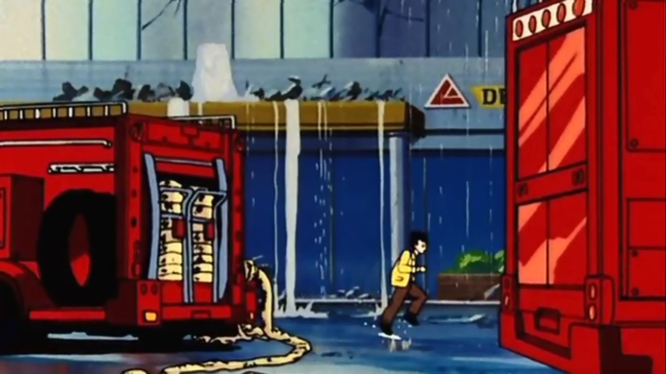 The Great Saiyaman then proceeds to punch a hole into the water tank, releasing the water at an incredible rate which leads to the water cascading down the entire building and putting out the fire.