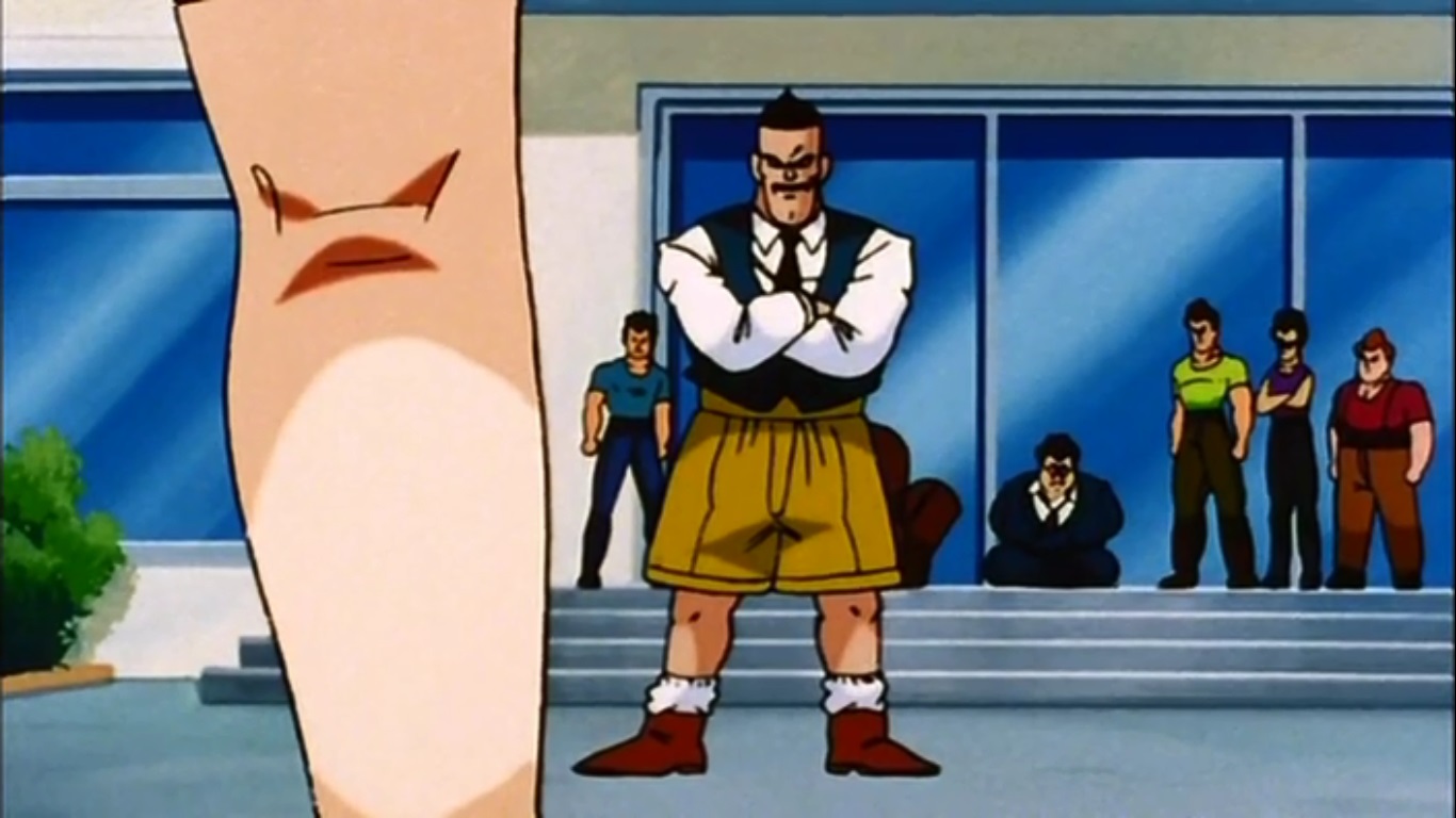 Videl leaves class immediately to confront the thugs, and Gohan tries to go soon after with a bathroom excuse. The teacher isn’t about to buy his bullshit though, so he’s stuck there bemoaning about Videl’s chances without him there to protect her. She arrives at the crime scene to tell Nappa that Hercule isn’t about to waste his time on a scrub, and the only person he’ll be able to fight is this bitch right here. He accepts the challenge and… wait, what the fuck is he wearing?
