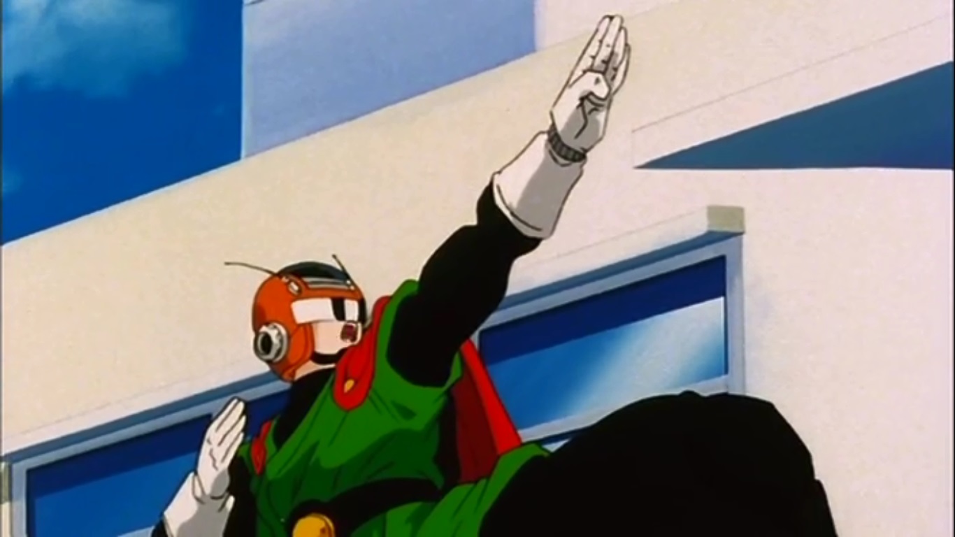 The fight begins and Videl is doing fine, but Gohan is still freaking the fuck out in class. He begins to fidget in his seat which is enough to cause a fucking earth quake which gives him the opportunity to escape. We cut back to Videl who’s kicking Nappa’s ass, but then he pulls a cheap trick (a criminal is willing to CHEAT in a street fight!?) and gets a shot in at Videl. At that moment, The Great Saiyaman flies in to save the day because obviously Videl can’t handle the situation herself.