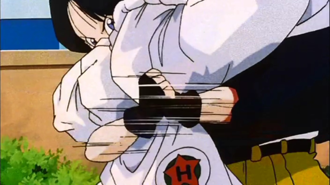 Videl (despite being a crime fighter, only acting once someone she knew got hurt) springs into action and lands a jump kick to the dude’s face!