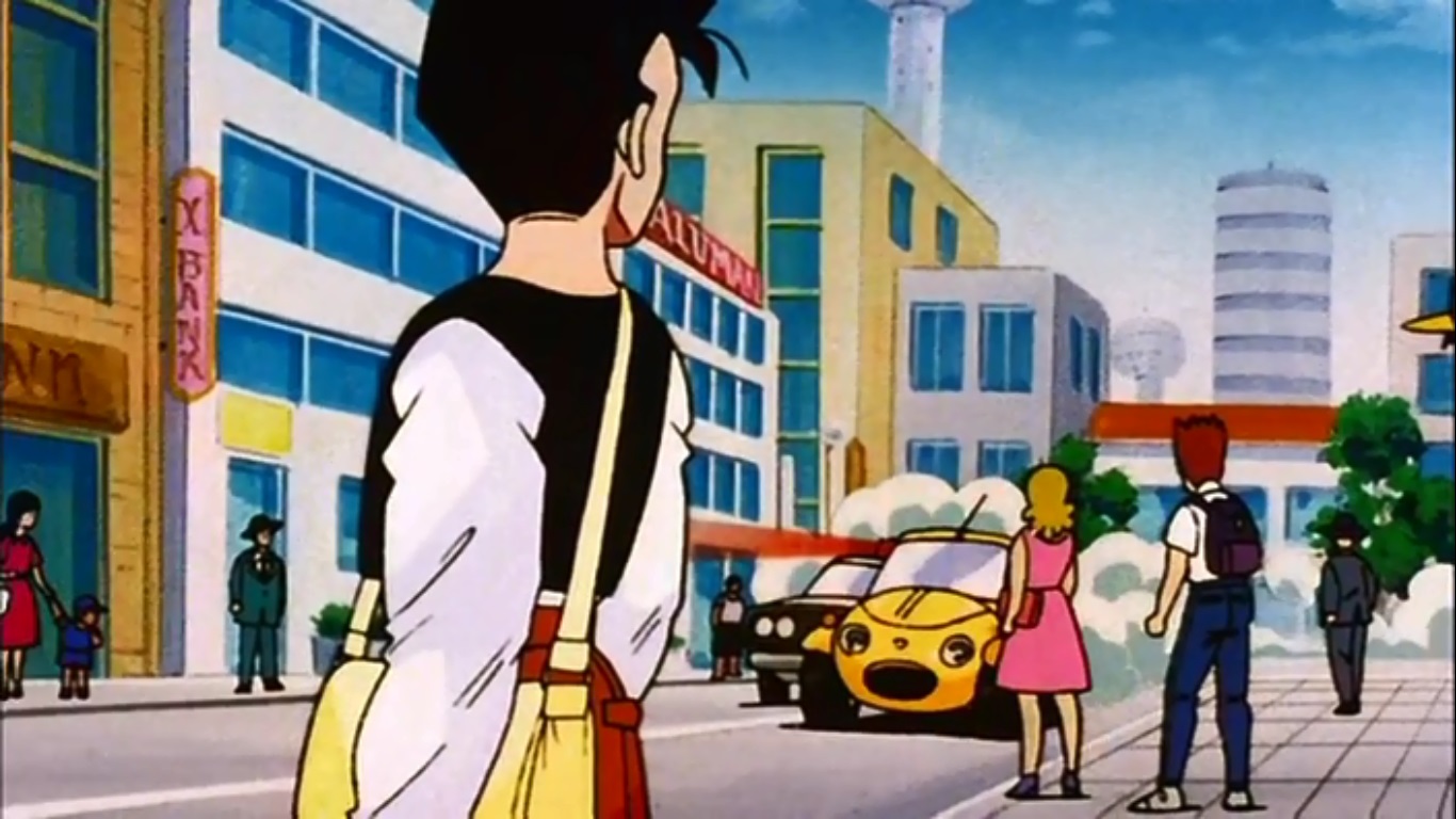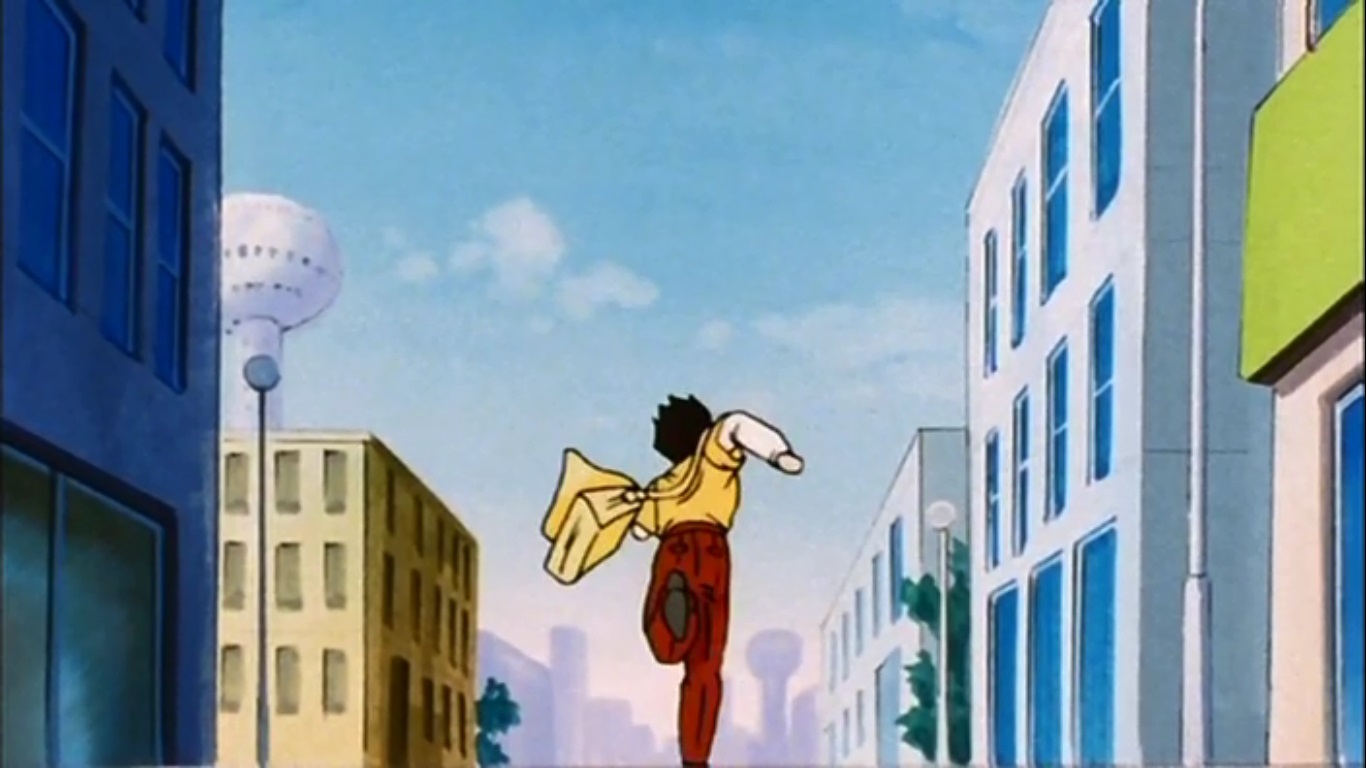That’s right, we go to Hercule “Mother Fucking” Satan who’s talking shit about The Great Saiyaman (by himself where no one can hear him obviously). I always had a soft spot for the guy. Even though he is an egomaniacal jackass, you can’t deny that he’s REALLY good at it! Despite his bluster, he still has a lot of charisma and knows how to work a crowd (like any good professional wrestler can). After these glorious few moments with Mr. Stan, we cut back to Gohan who’s walking home from school when a crime in progress just so happens to pass by.