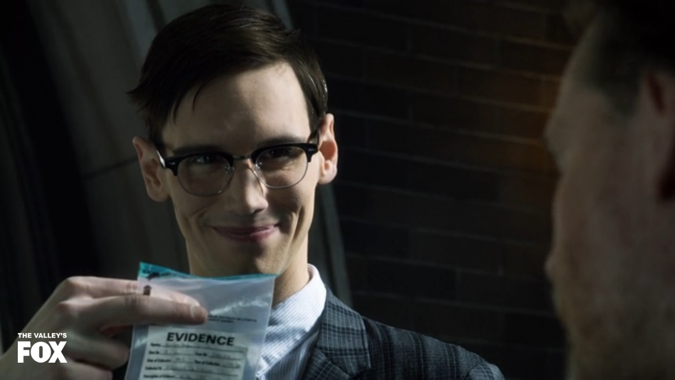 I don’t know what to make of him. He’s mean, he’s hot headed, and he’s kinda creepy, which are all things I think of when I think The Penguin. Yet, he just doesn’t seem to have that “thing” that lets us know he’s going to be a criminal mastermind instead of just staying this lady’s peon. I admit he’s still young, but he’s still not convincing me he’ll naturally get there, so maybe there’s gonna be some big tragedy at some point that’ll change him. When we first see him, he’s holding an umbrella for Fish who’s kicking the crap out of some guy who’s been stealing money from her. One of Fish’s employee’s (she owns a burlesque club) informs her that Bullock is waiting for her, so she leaves some thugs of hers along with Cobblepot to continue dealing with the thief. While Bullock is talking to Fish, Gordon heads out back to see what the noise is. He notices Cobblepot beating the dude with a baseball bat, but doesn’t take any action to stop it. It’s a decent way of showing how little authority the police have in certain situations because of how ingrained the criminal organizations are in this town. Gordon returns to find Bullock and Fish have finished their talk which seems to have amount to ABSOLUTELY NOTHING, because we immediately cut to Gordon at his apartment. This scene though is fucking amazing. First of all, his apartment is MASSIVE and incredibly well furnished. His girlfriend has amazing clothes and looks like a super model. Her acting is so god damn wooden, and her lines are nothing but reassurances, that I swear this woman is written like a wifu.