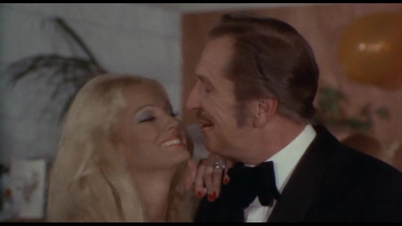 Paul gets up and addresses the audience, which turns out to be a great scene because of how much gravitas he can lend to a speech about a movie called Dr. Death 5. We find out that the writer of the film is a friend of his named Herbert Flay (Peter Cushing) who used to be an actor but gave it up to become a writer of schlocky horror. We also learn that Paul plans to marry the star of his latest film (Ellen) who is at best half his age.