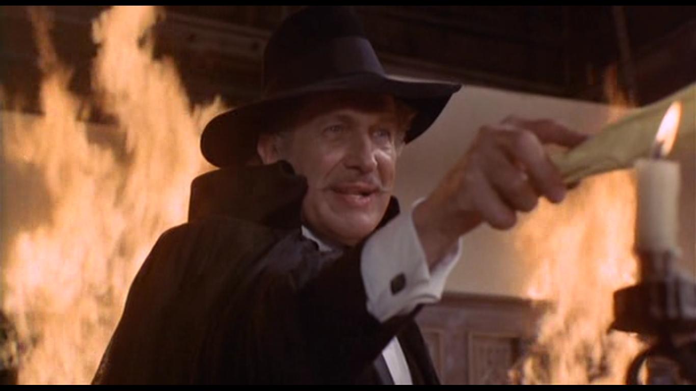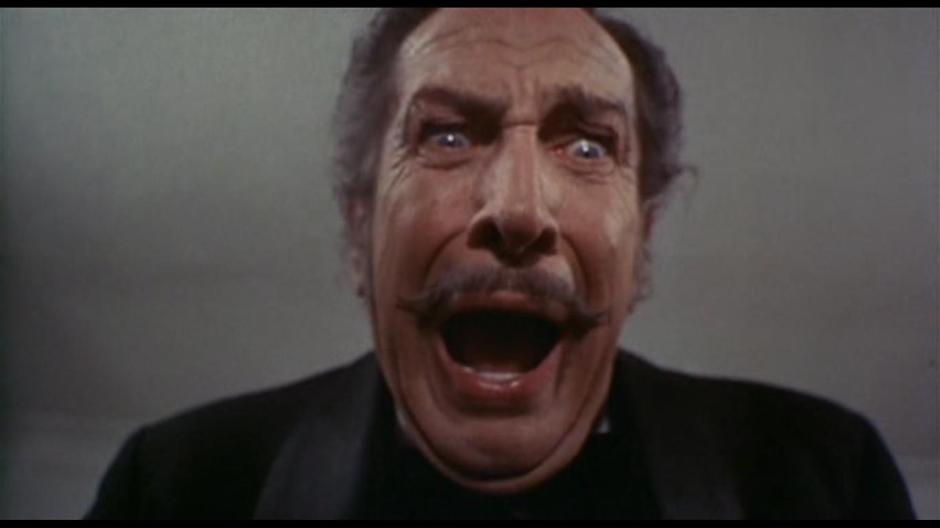 Paul is now a completely broken man. The trauma of having to relive the death of his fiancée was the last straw to break the camel’s back, or in this case the guy’s spirit. He’s been living with the fear of what he might have done for so long that he can’t even trust himself to believe that the man who chased him actually exists. For all Paul knows, he’s just a murder with a diseased mind. He carries Julia’s body to the set of his show and begins to monologue about the creation of Dr. Death and how it reflects the darkest depths of depravity and sin that man is able to conjure. While giving this speech to the dead body of Julia, he turns on the camera to record his final moments which are to set the room on fire and burn along with it, destroying Dr. Death once and for all. Wow. This movie has it’s cheesy moments and can be a bit uneven at times, but this speech makes it all worth it. Vincent Price is a phenomenal actor and seeing him just go for it in this one scene is nothing short of amazing.