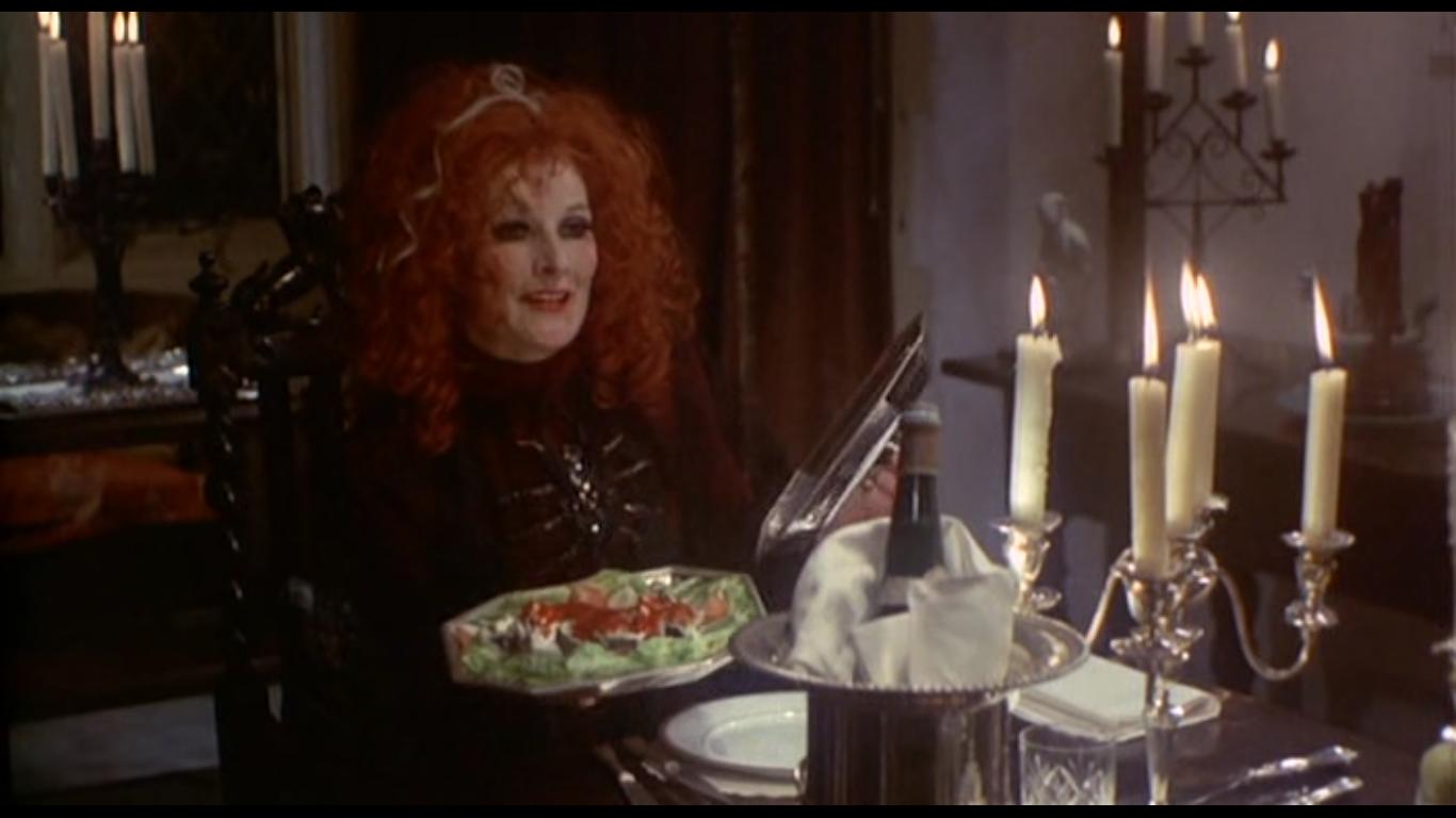 The death scene is kind of odd because for some reason everything in the room starts going haywire in a way that looks like the room’s haunted by a ghost. The exercise bike starts spinning, the jukebox starts playing music, and even the punching bag starts swinging wildly. If this is in any way related to the man in the mask who ends up killing her, then why the hell did he put this much effort into scaring the crap out of her before just finishing her off? Even if he just did it for the jollies, I don’t see a way HOW he can make all this stuff happen. Anyway, the body is discovered soon after and Paul runs to the basement to escape the accusations of those attending the party. He find Faye down there and talks to her about his fear that maybe he is the one doing it without being consciously aware of it. Maybe Dr. Death is real and is starting to take over the way the Mr. Hyde overtook Jekyll. Once again, Vincent Price shows his acting chops here where he effortlessly conveys a man on the edge of completely crumbling from the weight of what’s going on around him and his inability to trust himself anymore. Faye as well does great here (played by Adrienne Corri), continuing to play the insane hag but still tries to quell some of Paul’s fears.