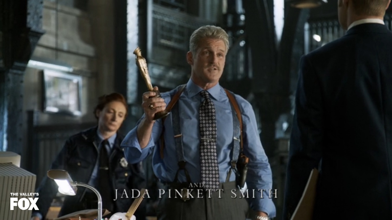 This. Is. AWESOME!!! Okay, we all know that a weather balloon cannot lift a human being, and that inflating it is not an instantaneous process, but the gimmick here is pretty damn solid. Some guy uses balloons to send his victims into the stratosphere before eventually landing back down to Earth with a messy thud. The way this episode starts (Cobblepot on crime street) as well as this new villain leads me to think (or at least hope) that Gotham is finally figuring out what tone to give this show. If it continues to be a gritty comedy, then I can get behind it! Naturally Gordon and Bullock make it to the scene to start investigating. At this point, the show helpfully informs us which is the RIGHT opinion, and which is the WRONG one. Bullock says “The killer did good by getting rid of a scumbag.” Gordon says, “He was never tried, and even if he was guilty, the law shouldn’t be taken into someone’s hands.” Thanks for letting us know right away how to feel about it by having literal good cop and bad cop explain the two sides. Once the two of them get back to the police station, we meet this episode’s police corruption effigy who’s planning to beat the shit out of some perp.
