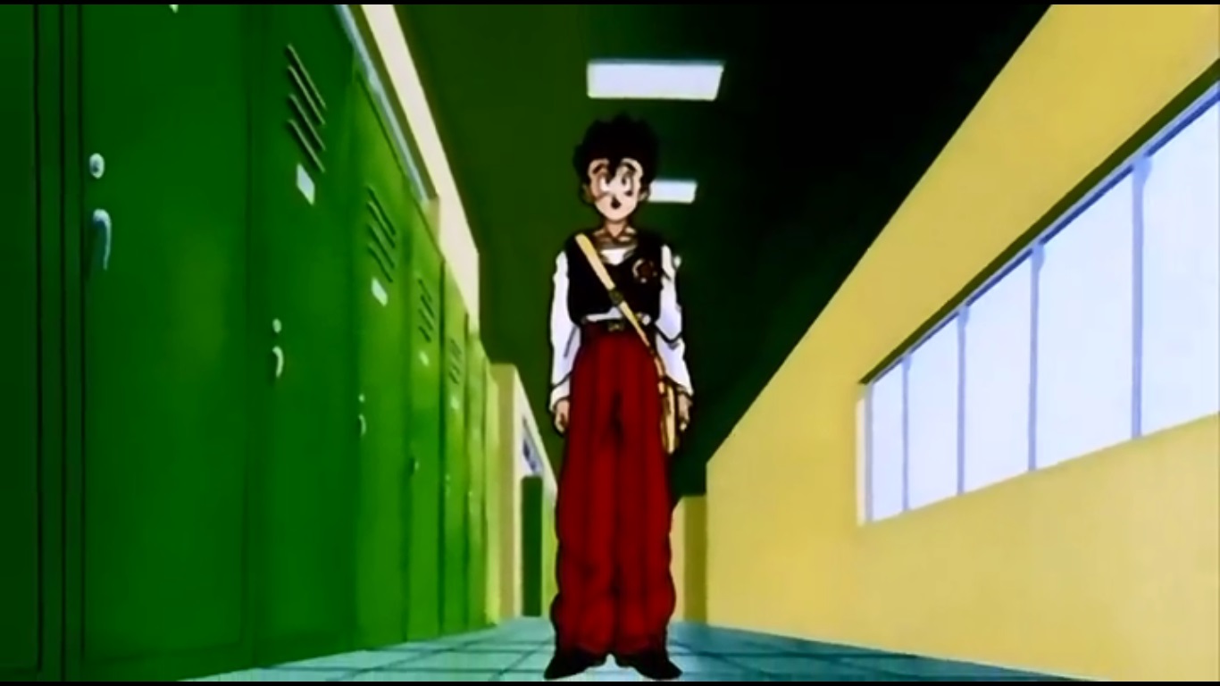 Don’t worry, the dragon’s fine. In fact, it seems that Gohan took the most damage because he got a huge cut on the side of his face. Now that one of the dragon’s has been subdued and the circus owner now longer has a gun, Saiyaman takes this opportunity to take the dragon back to his home while the mother dragon and the baby follow close behind. While Saiyaman is flying away, the circus owner loses his shit and starts screaming his intent to steal the baby back. The cops however have other plans because while it’s not illegal to steal a dragon, it IS illegal to steal an officer’s firearm. Hold on, back up a second. It’s NOT illegal to steal a dragon from its nest!? That seems like a VERY obvious law to write, if for no other reason than to NOT GIVE THE ADULT DRAGON’S A REASON TO GET PISSED AN GO GODZILLA ON THE TOWN!!! Besides the revelation that the laws protecting animals in this country are woefully lacking, it seems that everything has wrapped up quite nicely for everyone. The next day at school, Gohan’s running late and runs into Videl in the hallway. She’s been waiting for him and finally backs his sorry ass into a corner he can’t escape from. The “Go” that The Great Saiyaman shouted earlier along with the cut on Gohan’s face gives Videl all the evidence she needs to conclusively deduce that Gohan is the masked vigilante.