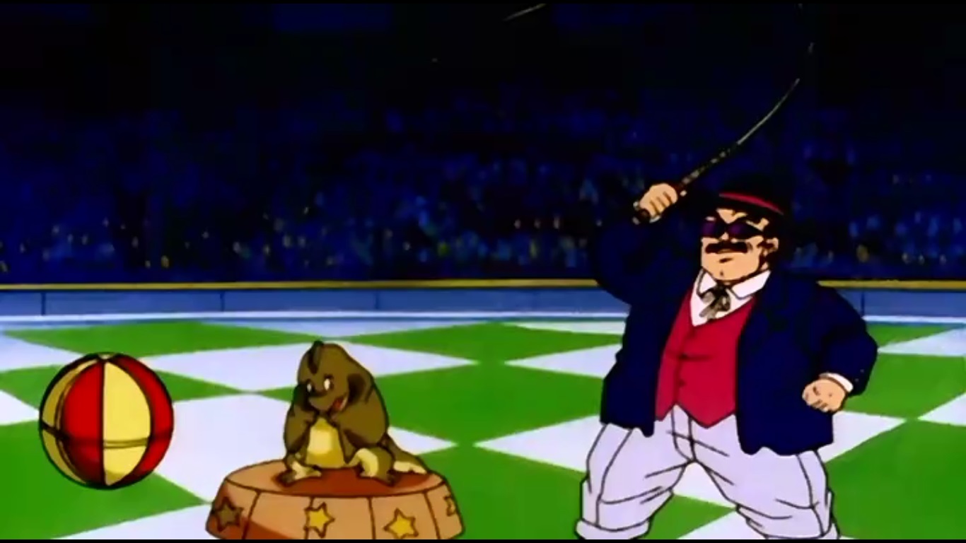 Gohan goes there the next day to see how the poor creature is being handled. I honestly have no idea why this terrified baby is such a boon for business. I mean the place is fucking PACKED and all the little guy does is tremble on a ball while some dude cracks a whip near him. FUN AND EXCITEMENT!!! WOO!!!! Gohan tries to convince the circus owner to let the poor kid go, but it goes about as well as you’d expect.