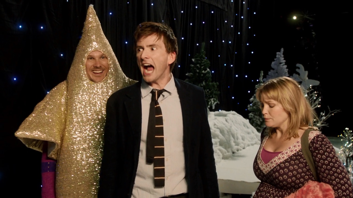 While they’re (somehow) locked inside, Roderick goes out with his choir (and the baby) to do his song.  The baby adds absolutely NOTHING for them considering it’s a straight up choir performance without any theme, choreography, costumes, etc.  Still.  David Tennant knows how to ham this shit up!