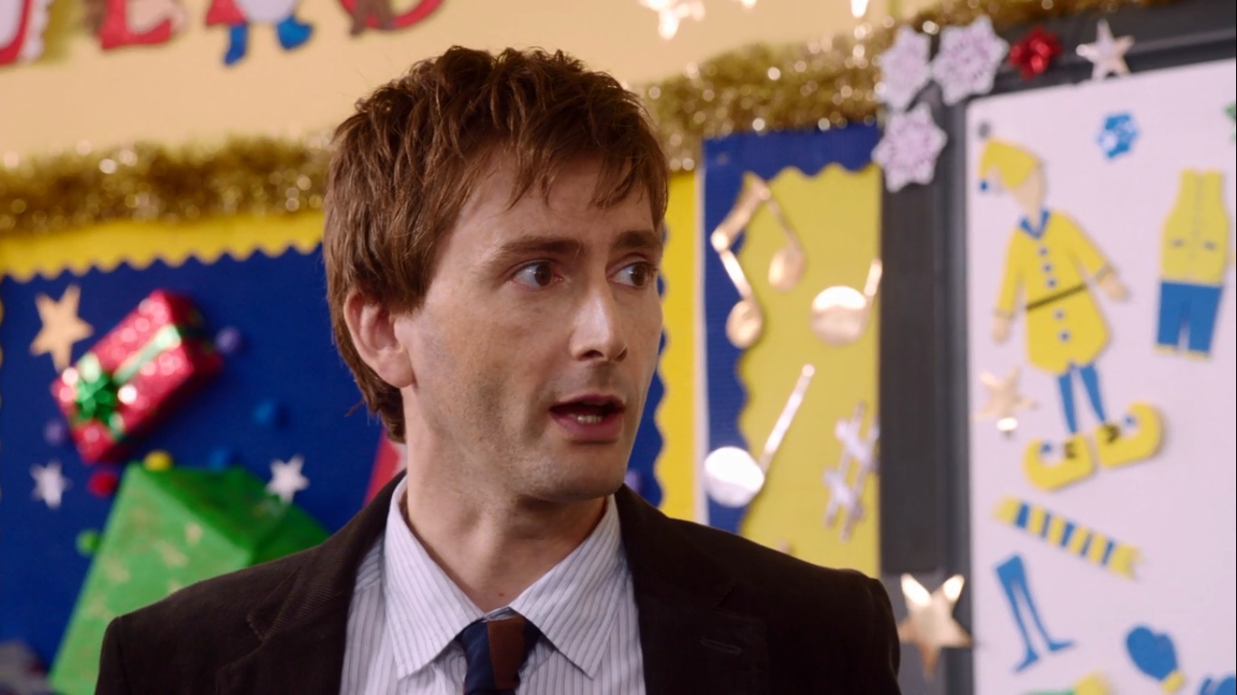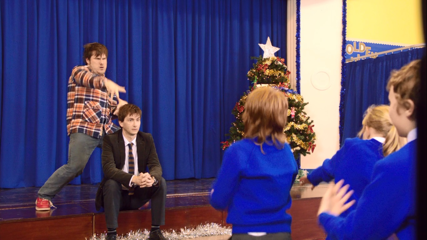Yeah, David Tennant (his character’s name is Donald Peterson) comes by for his first day and is immediately attacked by Mr. Poppy and the lost children for no god damn discernable reason.  DIDN’T YOU JUST FIND OUT THAT A REAL TEACHER IS NECESSARY FOR YOU PLAN!?  The principal comes out and chases off Mr. Poppy and the kids (who just leave the fucking school to visit Father Christmas) and takes Mr. Peterson inside to discuss his job offer.  She practically begs the guy to tolerate Mr. Poppy in exchange for getting a huge promotion almost immediately.  While the principal bends over a barrel for the benefit of her stupid nephew, he’s off at some… mall I think where Father Christmas is seeing kids.  When they get there though, a rival school (Oakmoor) is there and for some reason is practicing their song for the Song for Christmas competition.  Um… why did they have to leave their school to practice?  Shouldn’t they be learning math or something?