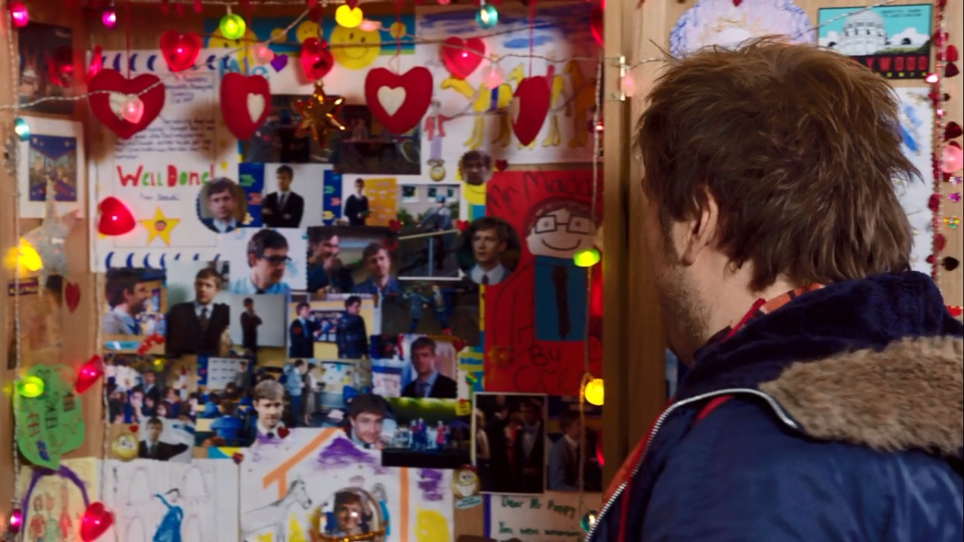 You know what?  Fair enough.  He’s new and has to find some way to wrestle control of this class away from Mr. Poppy.  Giving them a bit of leeway will help endear him to the kids.  After the song, he reiterates that going to Song for Christmas in a couple of days is just not possible.  Oh no wait, Mr. Poppy talks over him and tells the kids to bring in their baby brothers and sisters to audition them as Jesus and to use as a prop during their performance.  WHY DOES ANYONE TOLERATE THIS GUY!?  Mr. Peterson reiterates that no babies will be brought tomorrow and we cut to the end of the school day where Mr. Peterson opens Mr. Poppy’s private closet or something.  Inside there are pictures of Martin Freeman all over the place which as far as I can tell is the only direct reference this movie has to the first one (which I have not seen).