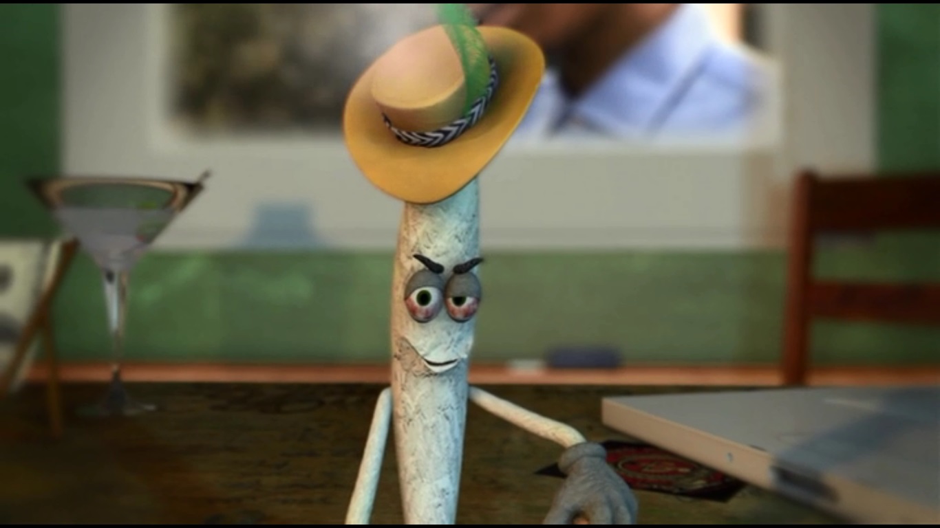 The movie begins by introducing us to the narrator of this piece. He will be coming in and out of the film at regular intervals to guide us through the complex range of emotions we will surely feel while watching this film. Our “Greek Chorus” if you will. He’s also a poorly rendered talking joint called Slow Burn.