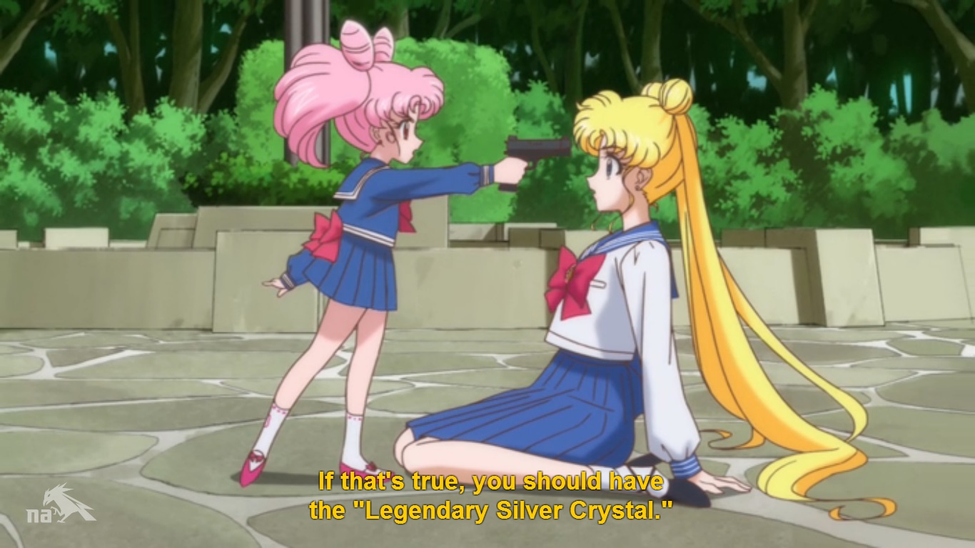 Usagi is now writhing in pain because of her bruised vertebrae and tries to confront this new challenger. Unfortunately for her, the little brat is packing some serious heat and the episode ends with Usagi staring down the barrel of loaded pistol.