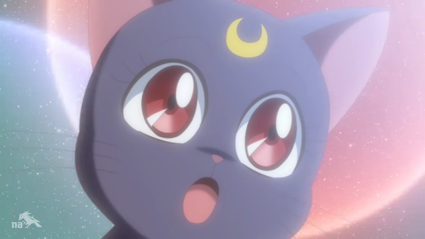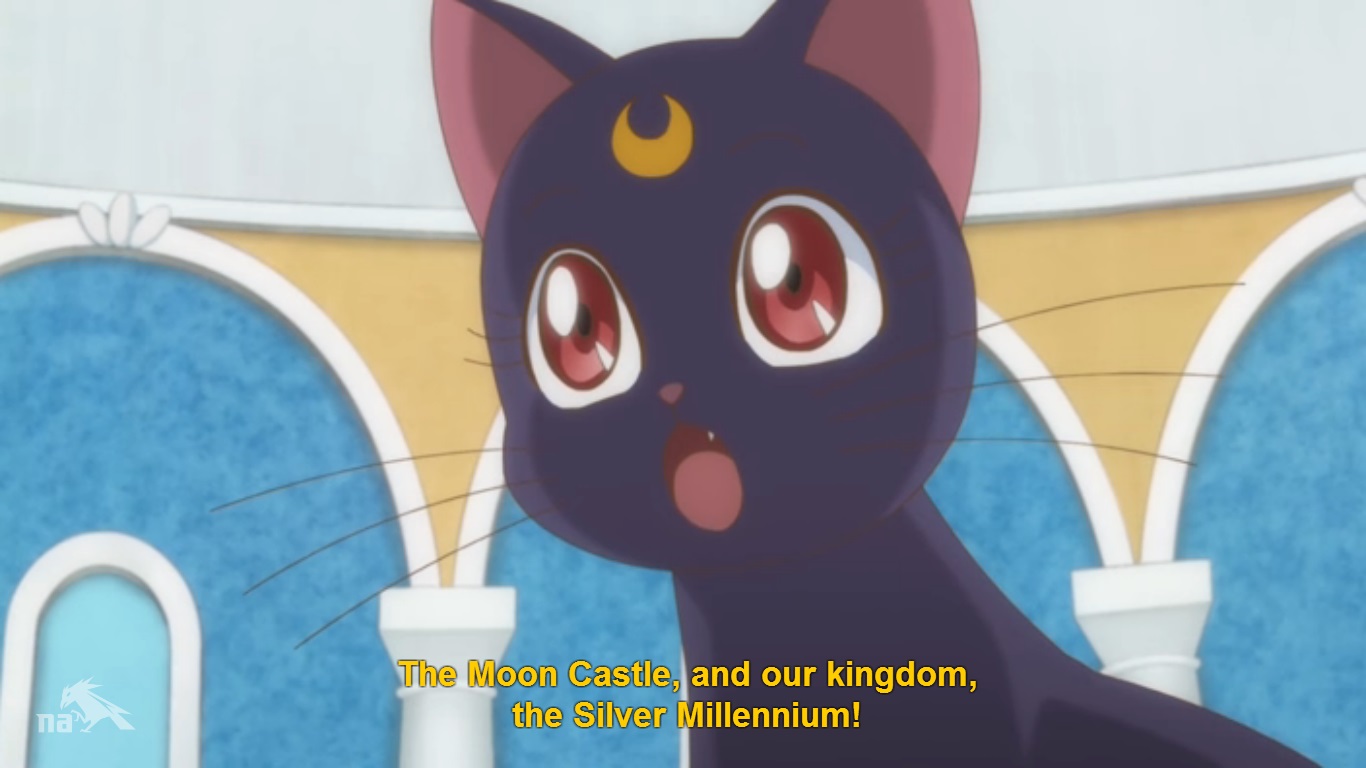 Somehow, Mamoru can see the entire world? And she’s able to see what HE’S seeing through his… hand? WHAT!? I didn’t even know Mamoru had powers! I thought he was just a dude!! They eventually find the (presumed) corpses of her friends, and Usagi begins to freak out when her cat starts to talk in her head from the Moon. Huh. This show is kinda weird. Anyway, Luna beckons them to the Moon which they can somehow instantly teleport to because of the Moon Staff thingy. The two of them get to the castle, and Luna and Artemis are there to greet them.