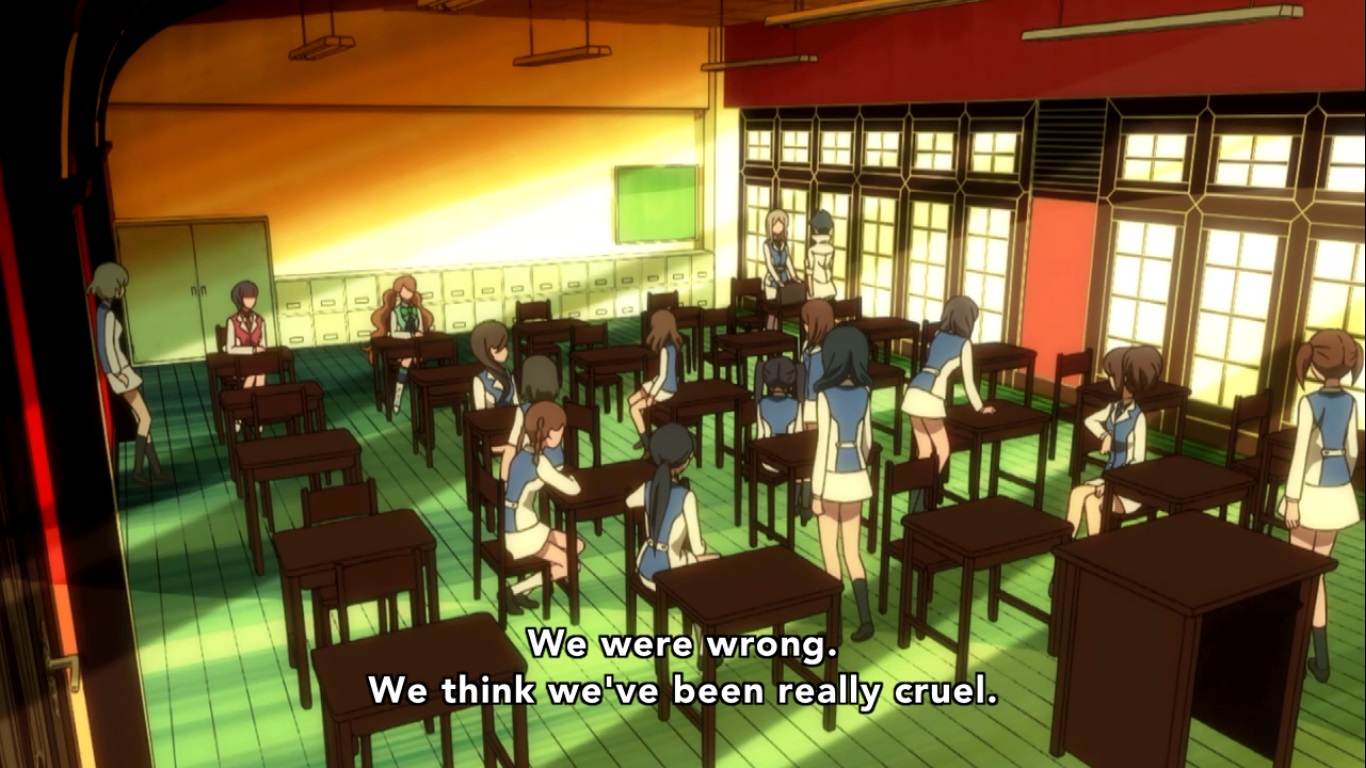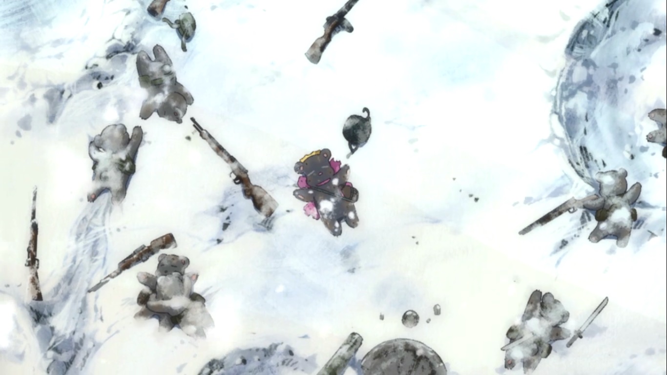 It’s weird because Kureha (who’s no older than six in this flashback) just strolls onto a fresh battlefield surrounded by rotting bear corpses and finds the one who ISN’T dead and declares themselves as friends. Like I said, I DOUBT this is to be taken literally, but I don’t know what the point of it is when you could have shown us a realistic portrayal of their first meeting. Does the war imagery add anything? I guess it shows that there was indeed a time where bears and humans were in heated battles rather than this sort of Cold War thing that’s going on now, but a revelation like that didn’t need to be crammed into a scene that already accomplishing something important. Back in the present, it’s the end of the school day and Kureha is about to head home when one of the awful students in her class comes up to… apologize? WHAT!?
