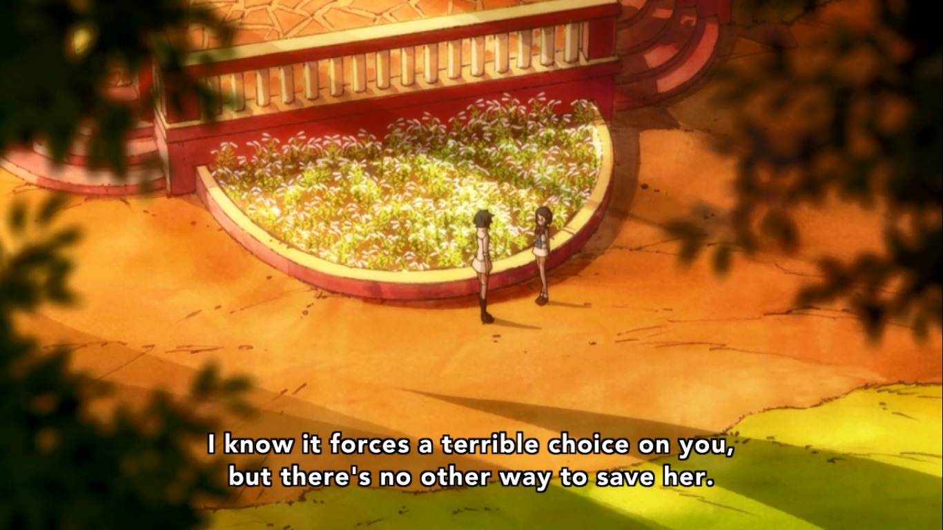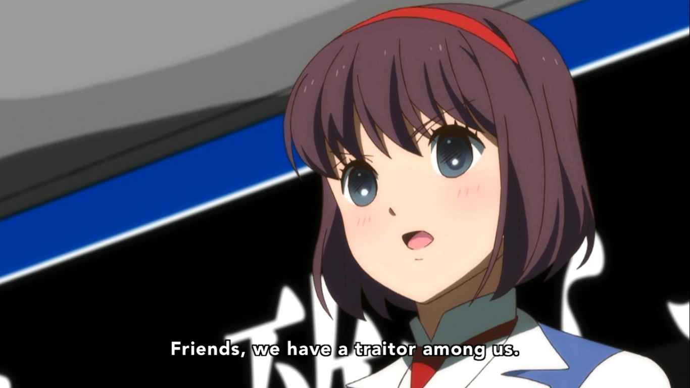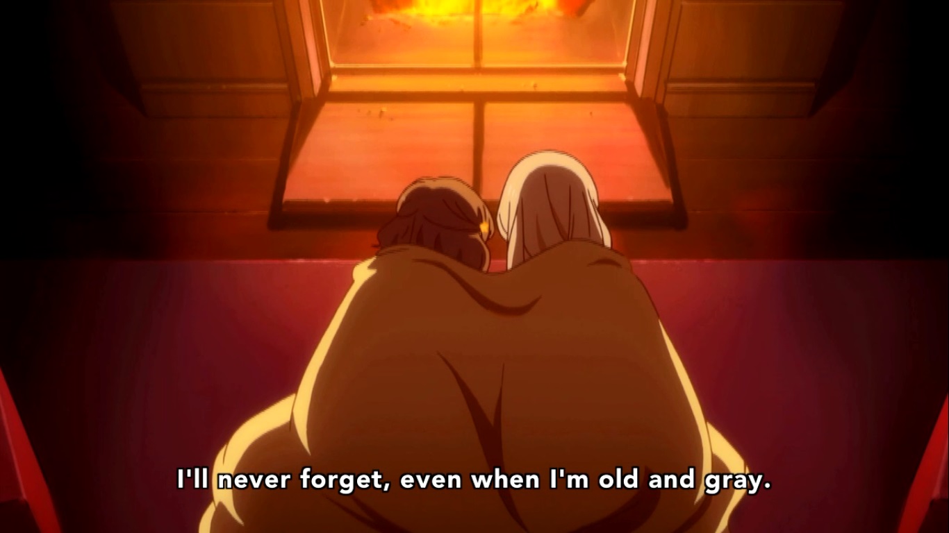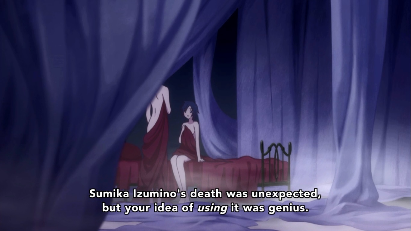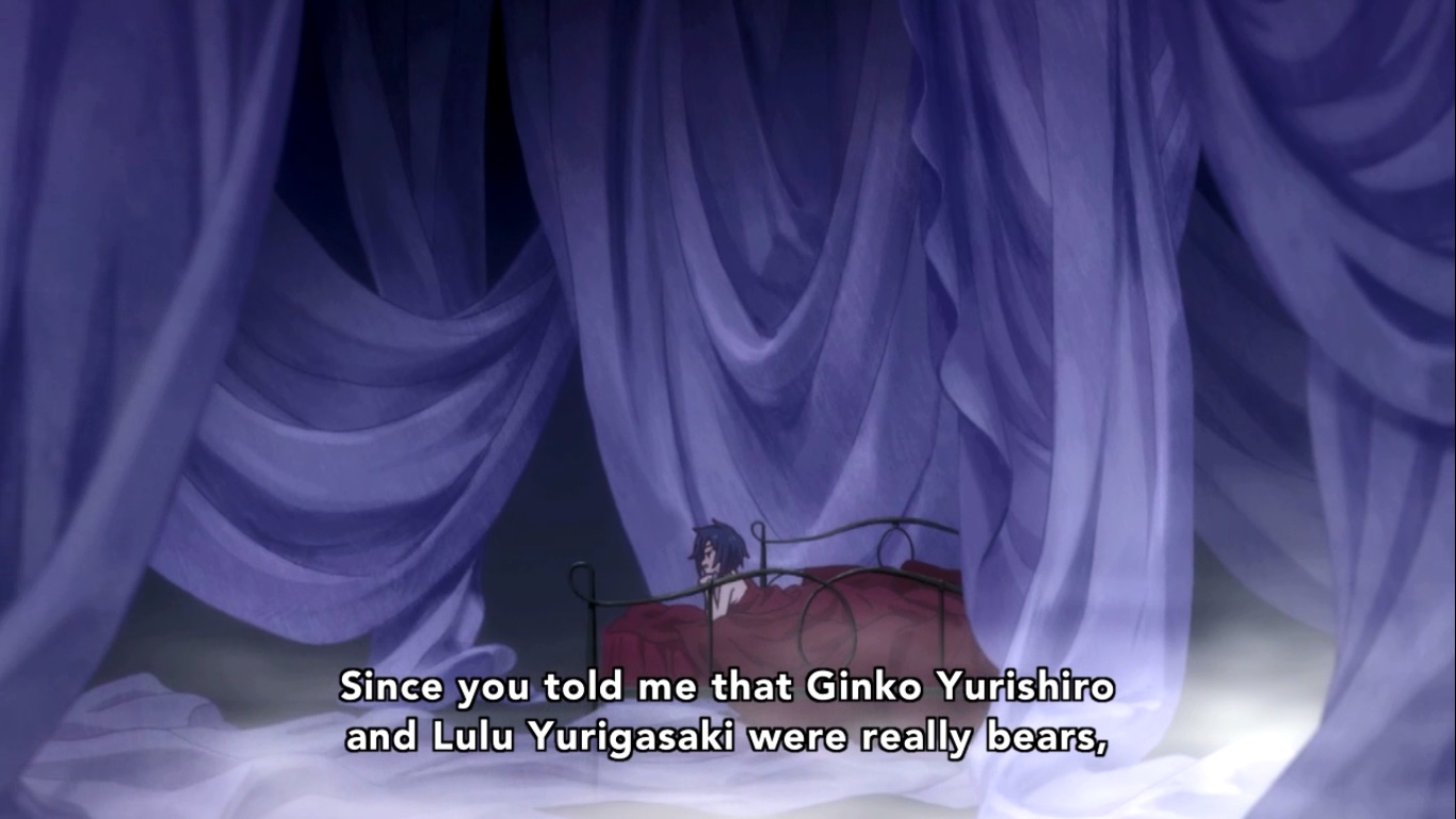 So yeah, Sumika willingly martyrs herself by… being excluded I guess. She writes the letter to Kureha and plans to give it to her some point soon before she gets killed by bears which apparently has to happen now. She also gets visited by Kaoru (the leader of the exclusion ceremony in the present and the one who set the trap for Ginko) who can definitely piss off. I guess the Exclusion Ceremony decided that because Sumika messed with their predetermined vote, that they’ll have to wait until Kureha’s birthday to exclude her because of reasons and are already planning her birthday party. Sumika is cool with this because Kaoru promises to protect Kureha by being her friend after Sumika is murdered. I don’t get how that works, but considering what Kaoru is planning on doing to Kureha in the present, it’s probably just a flat out lie that Sumika was dumb enough to believe.