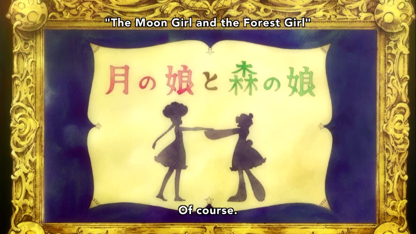 So the Moon Girl (Kureha) drops her mother’s pendant from the moon onto the forest below. The Forest Girl (Ginko) finds it and starts to imagine the world beyond the sky. The moon girl meanwhile is uber sad that she lost the damn pendant. The both of them (I think their aware of each other but don’t actually know anything about the other) appeal to the Goddess of the Sky (Kumalia) to allow them to cross to the other’s world. Kumalia denies them at first but eventually capitulates and gives them each a pathway to the sky that divides the two worlds. Once they get to the divide, there’s a giant mirror that keeps them separated and they have to destroy their own reflections in order to get to the other side and give their friend a promise kiss. The catch is that destroying the mirror might cost them their lives. Will they risk their lives to prove their love? The story ends before we find out what the two of them decide to do.
