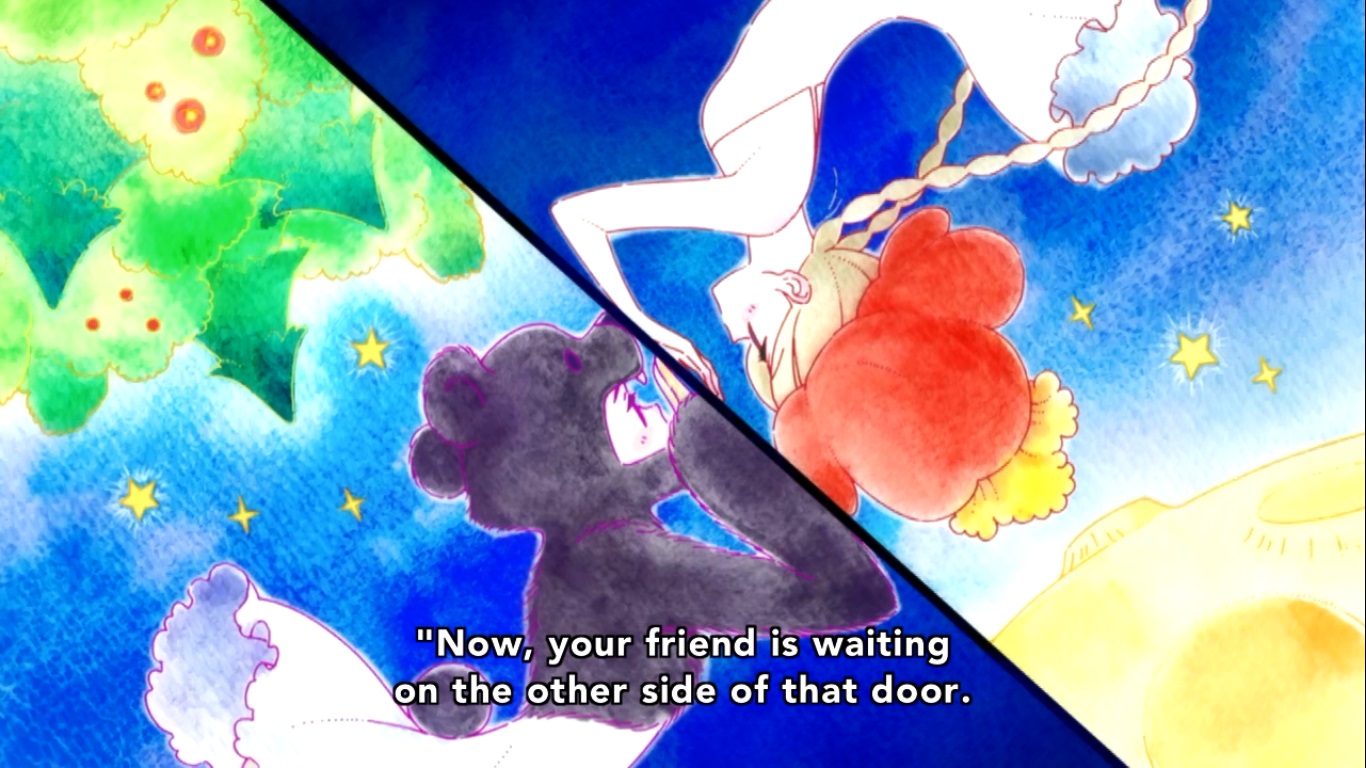 Alright, so let’s parse this out a bit. The two worlds are obviously the human world and the bear world (nature in general I guess?) that were brought closer together (sort of) when the Kumalia planet did its thing and gave the bear sentience (and presumably the power to shape-shift). Anyway, the two kids (Kureha and Ginko) were brought together by Kureha’s mother (the pendent) but have always been separate due to either the literal wall of severance or the fact that they are from two different worlds. The mirror I guess is supposed to be them betraying their true nature (Kureha hating bears and Ginko… I don’t know, eating invisible girls?) which they have to do in order for this friendship and or romance to work out. The story itself is decent enough, but what really sells this scene is the fantastic artwork. The animation may be limited, but the art style here is just a delight to look at. What muddies this part of the episode though is that I still don’t know if this is even close to what Ginko wants. Does she want to be friends or just eat her? She’s said numerous times that she wants to eat Kureha, so is this a fairy tale of friends from different worlds coming together, or is it a dark retelling of the Red Riding Hood story? Is GInko a friend that Kureha needs right now, or the one to lead her to her ultimate downfall? Maybe the ambiguity here is the point, but it’s still bothering me that we’re halfway through the damn series and this pretty simple plot point is being stretched out longer than it needs to be. After reading the story, Kureha tells Sumika that she would gladly smash the mirror because she’s willing to do anything in the name of love which inspires Sumika to never back down on love either. We get to see her prove this in the next exclusion ceremony where… I’m sorry, IS SUMIKA PARTICIPATING IN THE EXCLUSION CEREMONY!?!?