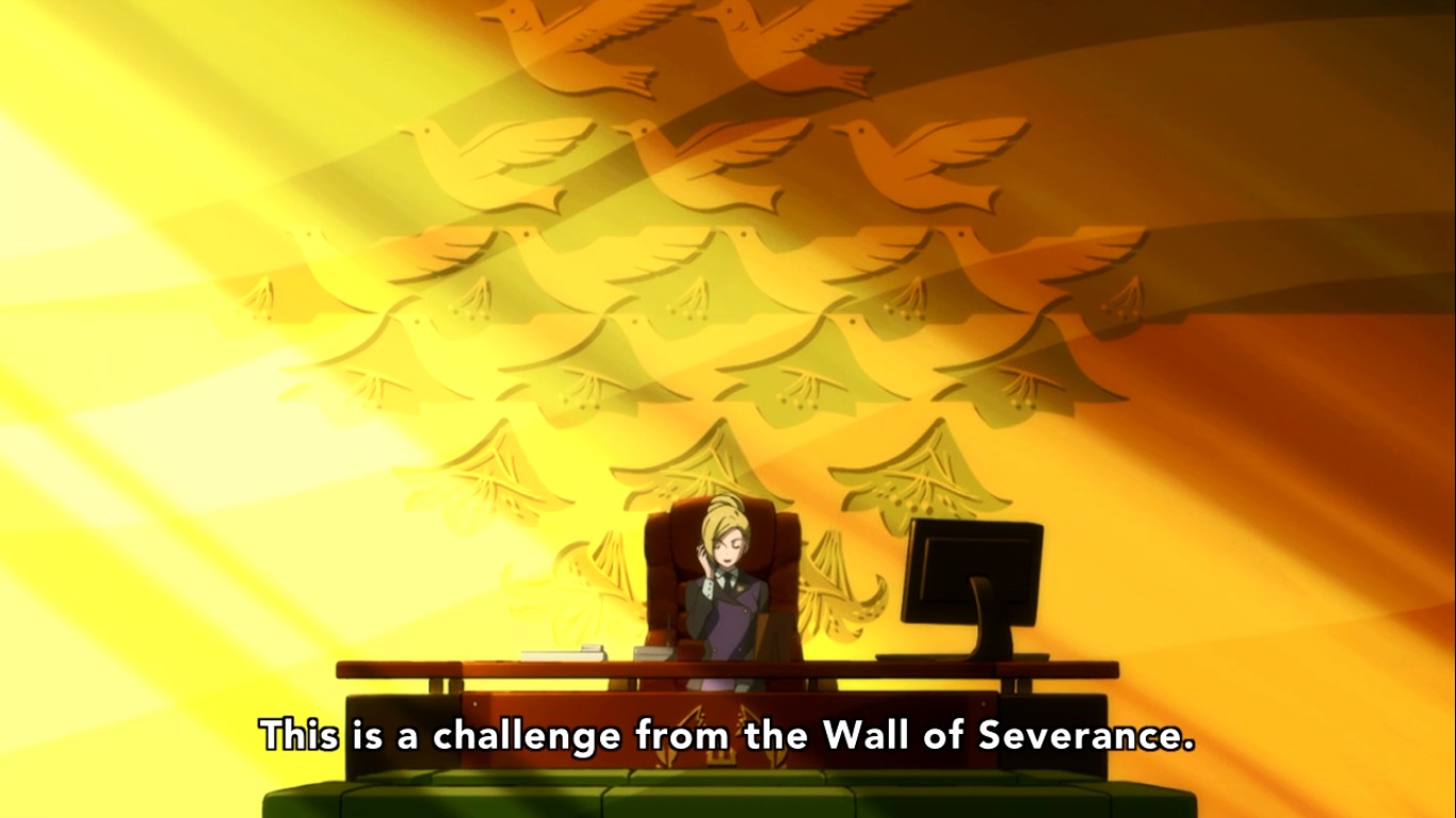So this was a really interesting episode, and I’ll give it a hell of a lot of points for being wildly inventive for most of it. It’s probably the best episode in the series in regards to outlandish concepts with mixed metaphors and constant symbolism because so much of it is packed in that the episode flies by in no time. The pacing is in it is frenetic so you never get bored with any one thing before moving onto the next. It’s still confusing at points with a lot of things that seem INTENTIONALLY unexplained (Mitsuko’s presence and Kureha’s acceptance into the Exclusion Group being prime examples), but it still manages to keep the tension and not get too bogged down in its own cleverness. There are some serious problems though that keep this from being as amazing as the last episode was. The Severance Court Officials still doing nothing of import and they’re presence has yet to be explained in any satisfying way. It wouldn’t be too bad, but they get more screen time this episode, and the one scene of Life Sexy peeking on underage girls is definitely the low mark of the episode, so their presence here is certainly not justified. Also, Lulu’s complete absence from this episode is absolutely baffling and feels like a serious oversight. We still have no idea how she’s reacted to GInko’s near-death experience or what her motivation was for telling Kureha the truth when she knows how much danger that would put Ginko in. It’s almost as bad as the ending to the previous episode where they just muted her for no reason, only this time they muted her presence entirely. Overall, it’s probably the best episode for those who love this show when it goes completely nuts and gets really edgy. I did end up liking this one overall, but I’m hoping for something more in the next episode. Only three left to wrap this thing up! Can’t wait to see how it all comes together!!