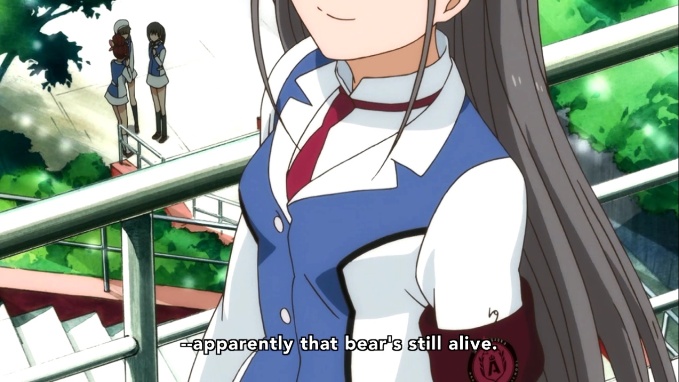 We then cut to the next morning where all the students are discussing what happened the night before. According to rumor, Kureha killed another bear on the roof, though the bear is supposedly still alive. And what’s THIS!?
