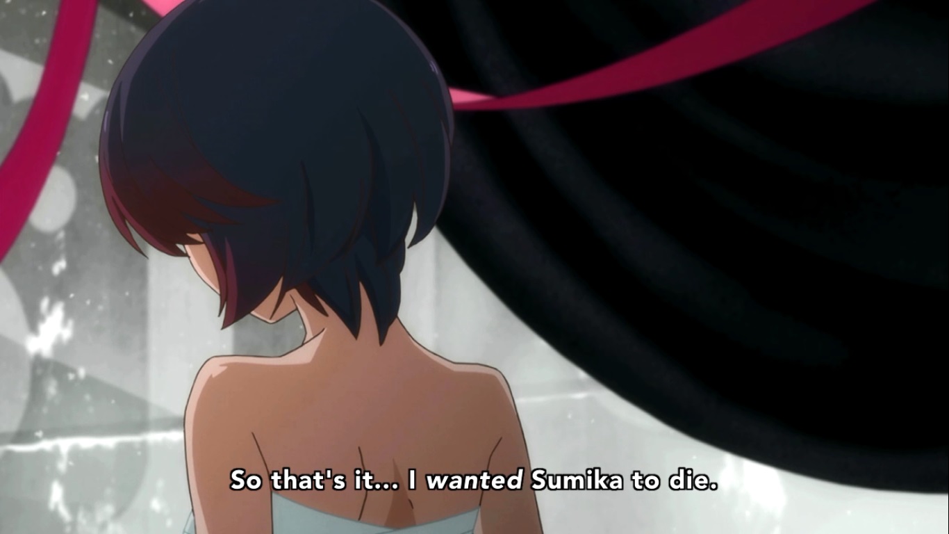 EXCEPT NOT REALLY!! We get a post-credits scene with yet another cliffhanger! It turns out that Reia wasn’t actually some ghost that was cradling Yuriika in her final moments. It was actually Kureha who placed her… shall we say “flawed” teacher, on the couch with her eyes closed and a bouquet of flowers. Despite realizing what a manipulative monster that Yuriika was, there’s still a lot of history between the two, so Kureha couldn’t just leave her corpse on the floor. It’s a small touch that I think speaks volumes to the inner turmoil that’s only been getting worse inside Kureha since this series began. Kureha also heard Yuriika mention that she had the hidden pages of the picture book and so she decides to find them so she can finally know how the story ended. What Kureha sees shocks her, and that’s how we end this episode!