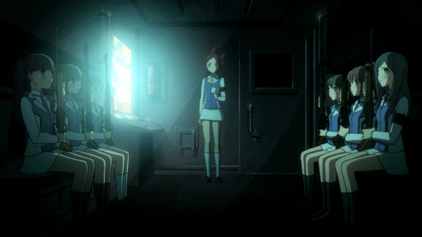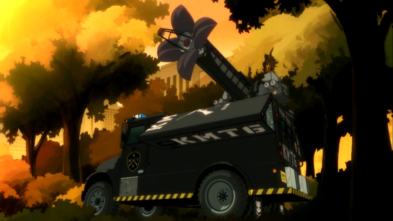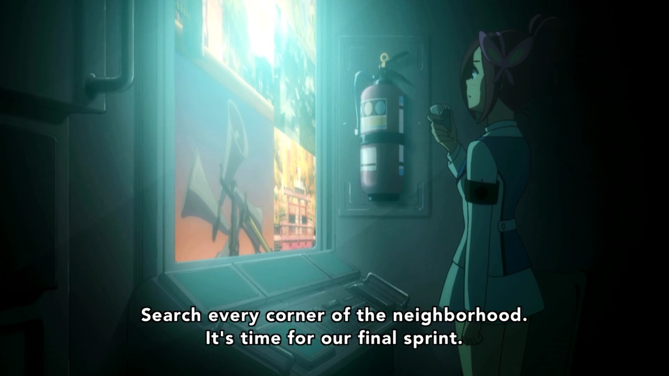 The schoolgirls wearing skirts and ties instead of Kevlar and combat boots arrive at the Kureha household in their attack vehicle and start to search the place. We once again get another flashback, but this one is VERY brief and probably intended to be some foreshadowing for later. They don’t give a specific date, but I THINK it’s the night Reia died considering that the Kureha in this scene is about that age. The bear alarm is going off in town and Kureha is in the park for some reason. We hear a voice (I don’t recognize it but it might be familiar to those who pay attention) say “I don’t want to be alone.” Kureha turns around to see who said that and we cut back to the present where the Exclusion Group is still scoping out her house. Kureha was smart enough to now it was a setup, so she and Lulu have already escaped and are now on the lam! This won’t deter Oki though because apparently she has a surveillance system throughout the city to rival that of Batman in The Dark Knight.