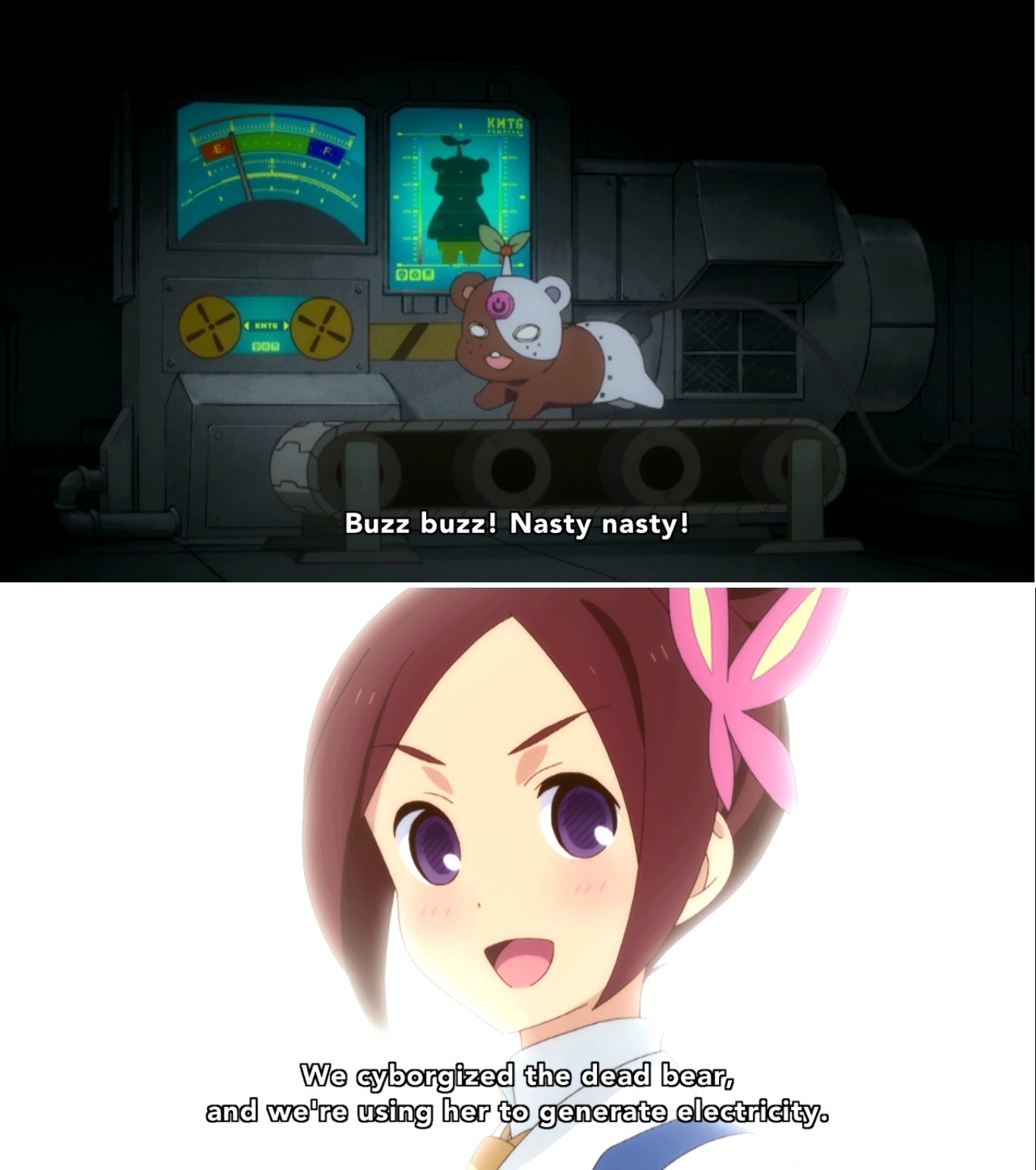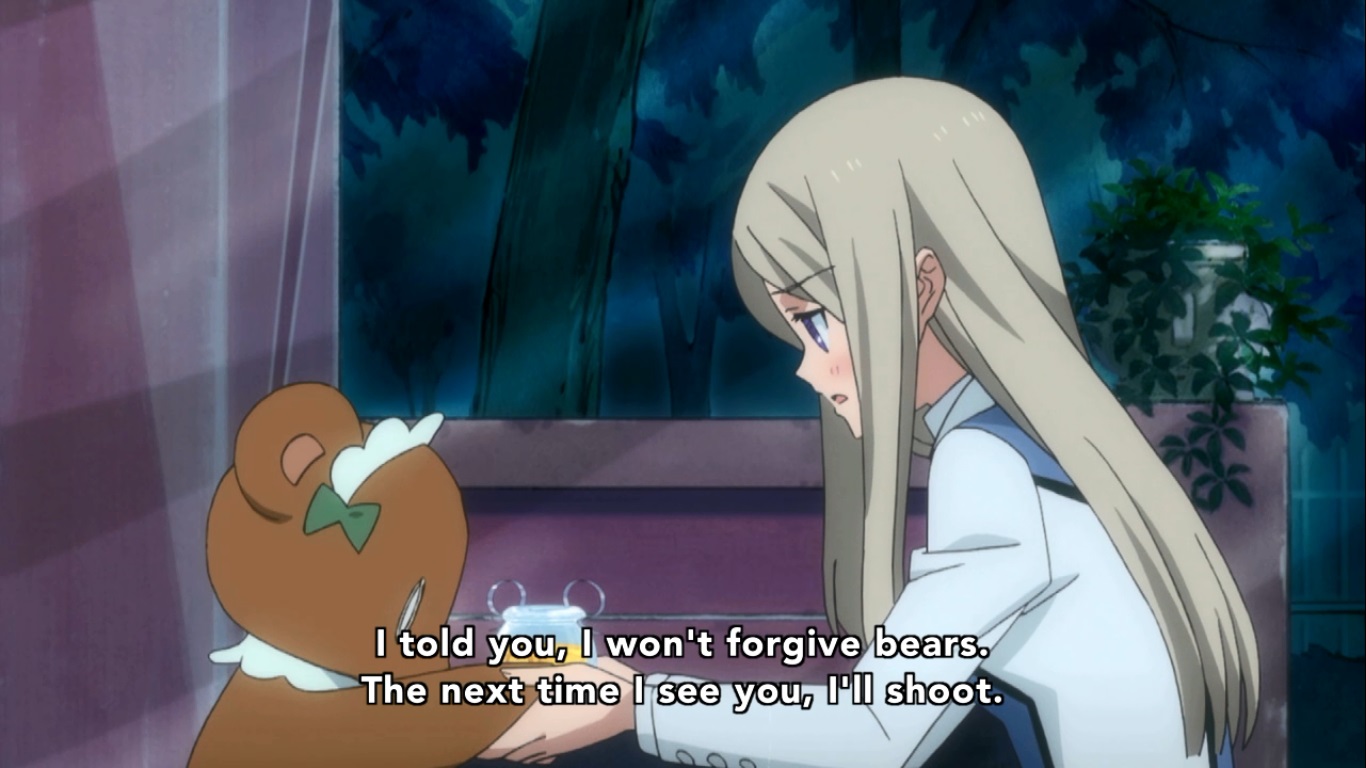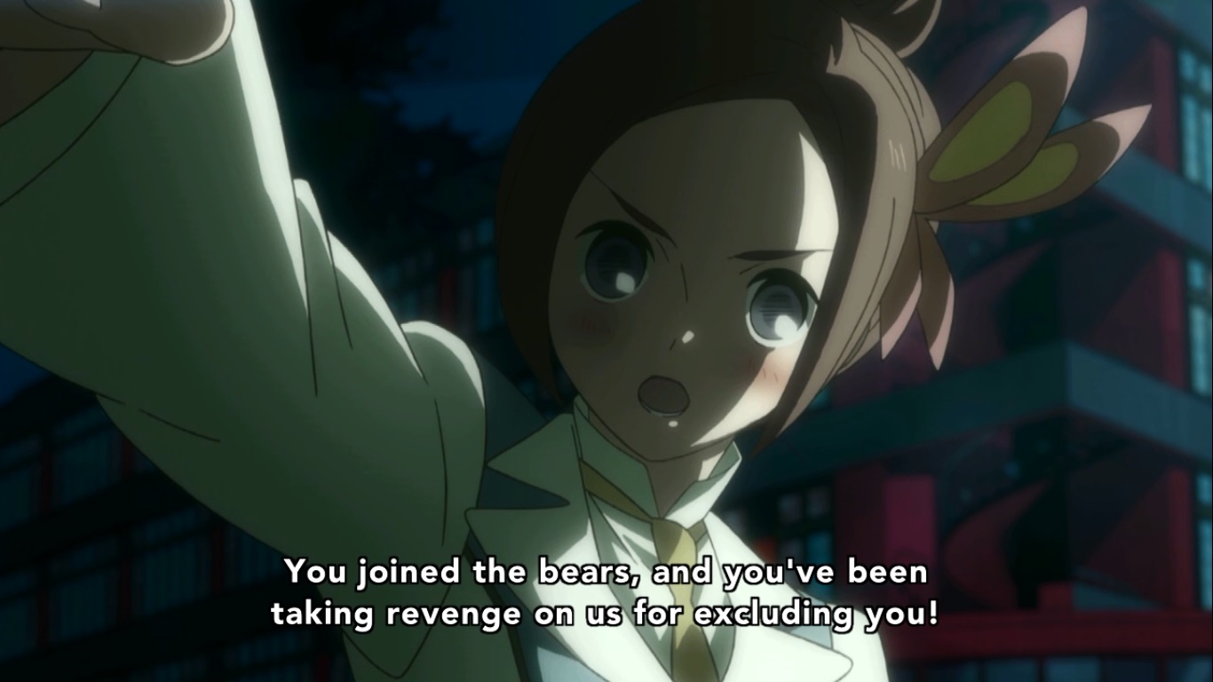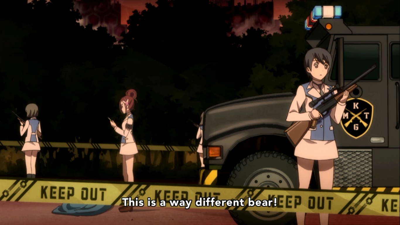 This is yet another great episode for this series that’s proving to be quite remarkable in a lot of respects. What helped this episode out immensely is that characters took the time to talk to each other and discuss things! Even the things that don’t make any freaking sense at least get ACKNOWLEDGED as such! While a lot of other episodes would be a bit meandering in service of some sort of metaphor or overarching theme, this episode was right in the middle of the action and treated each character like real characters instead of symbols to stand in for some greater theme or whatever. The only thing that kind of hurts this episode is the weird changes that happened all of sudden between this episode and the last. The Exclusion Group becoming militarized? Sure. They’re stepping up their game now that their principal is dead and turns out to have been a bear (though it would have been nice to have SOMEONE had brought up THAT important detail). Where I draw the line is SWAT trucks, reanimated bear corpses, and A FREAKING LASER BEAM!! This show has dabbled in the absurd before (the great war between bears and humans is a good example) but all that felt COMPLETELY out of place and unnecessary. Did they NEED all that hardware to do what they did in this episode? They would have been just as threatening if it was just a group of the girls carrying rifles and would have had the added bonus of not being as silly as a tactical response team made up of sixteen-year-olds. If all that was in service of some bigger point the show wants to make, then it was completely lost on me. Then again, what else is new for this show? Anyway, I really dug the hell out of this episode and while it may be sad to say goodbye to Lulu, at least she got to make it out alive. We’ll find out in the next two episodes if Kureha and Ginko will get to do the same!