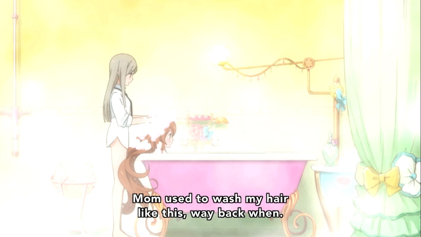 Kureha is super conflicted right now because this is basically her mother’s wish for her and Ginko, but she has to take into account what Ginko has done to her. She let Sumika die. How the hell can she get past Ginko doing something like that? Is it right to forgive her for this, or will Ginko once again betray her further down the road? Before she can ponder her situation further, Lulu arrives to return her mother’s pendant which she’s spent the last day or so looking for. Lulu begins to leave, but Kureha (looking for answers and maybe even a friend) invites her in to take a bath.