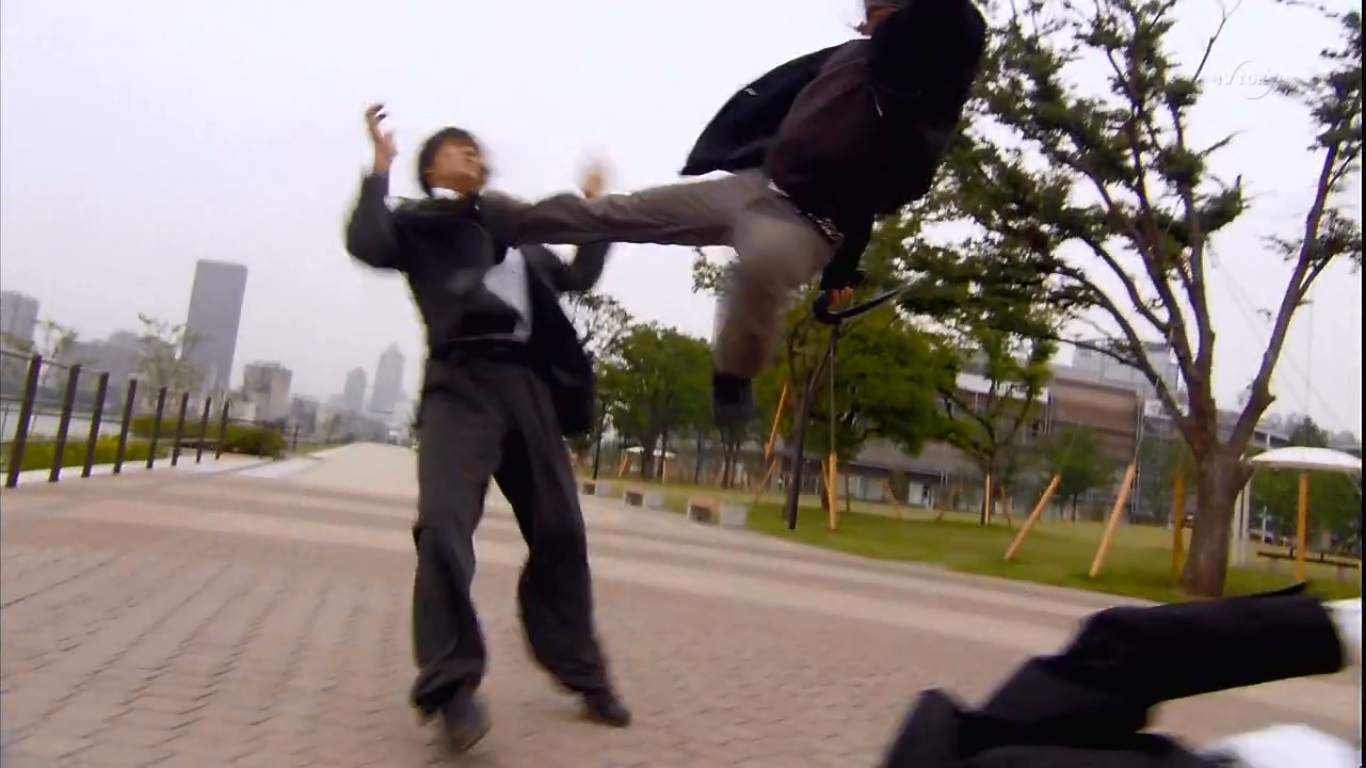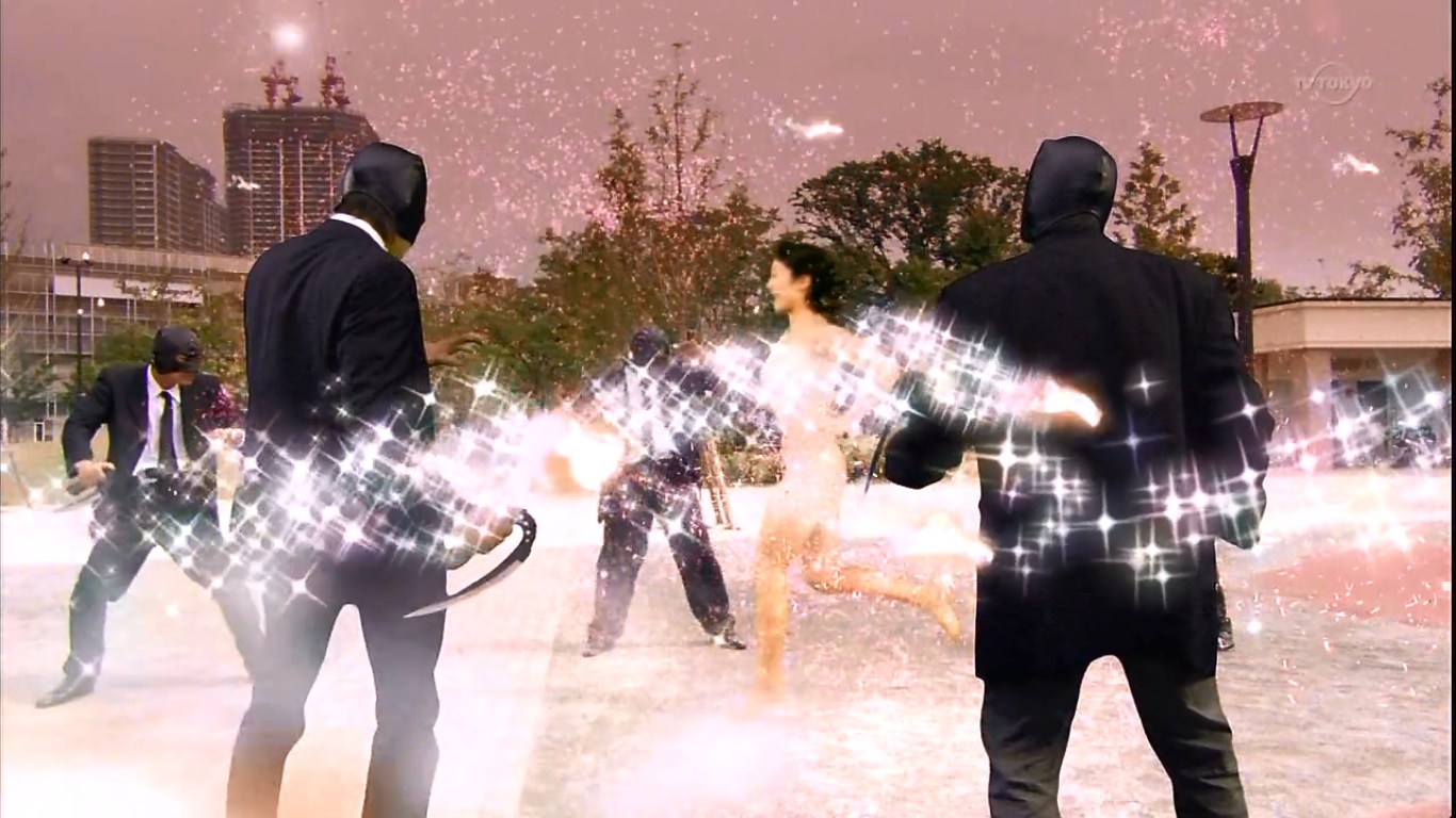 If you’re not aware of one of the staples of the Cutie Honey franchise, it’s that the transformation sequences take longer than usual and tend to strip the character naked briefly before putting the new outfit on. As you can see above though, it looks awful and the amount of lousy CG they put on top of it to make it acceptable for television is really distracting. Thankfully, this is probably the most gratuitous the transformation sequences get in this series, and the rest tend to be two or three seconds instead of the full twenty seconds of terrible looking not-nudity we get here. Once she does turn into her alter ego though, the show picks up DRAMATICALLY and becomes the most amazing thing ever! The gang tries to take her out, but they’re no match for her Kung Fu skills!