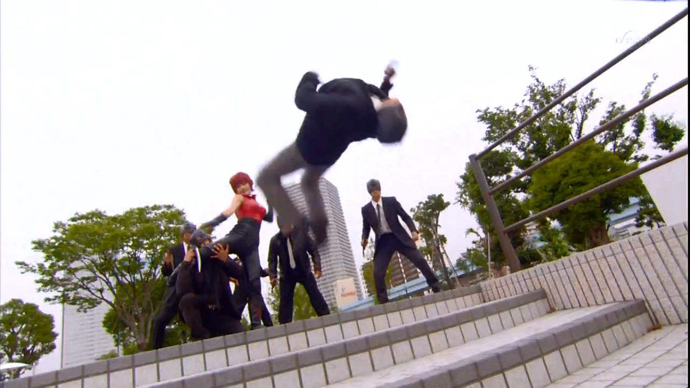 The choreography in this show is very reminiscent of Super Sentai, especially with the henchmen going COMPLETELY over the top with everything. This one dude tries to do a flying jump kick while Cutie Honey is standing next to a GIANT flight of stairs. Let’s see how well THAT works out!