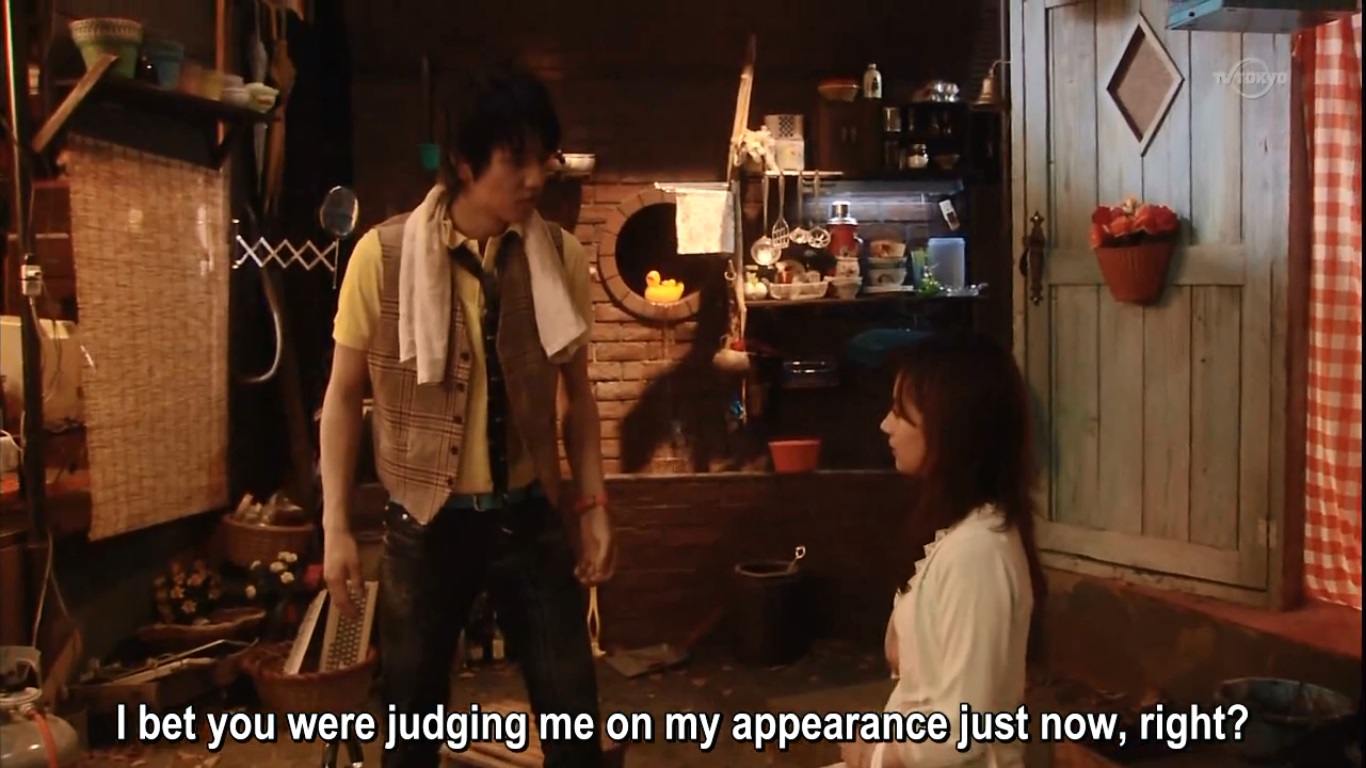 It’s a pretty well done sequence, though the overly dramatic violins they used for the music do the exact opposite of what it’s intended to do, though this show is ultimately a comedy so maybe the unsubtle soundtrack is simply an intentional subversion rather than a poorly done dramatic accompaniment. What the hell was I talking about? Oh right! After this scene (and the opening credits), we cut to the next day where a young woman is looking to use the services of the Hayami Detective Agency. This is probably a very poor decision because Hayami appears to live in a shack under the bridge.
