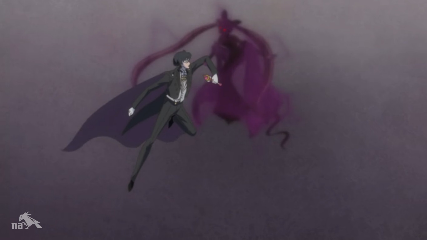 Sailor Moon (or Neo-Queen Serenity) is able to break herself and the other Scouts free of Prince Deamnde’s hold and uses her power to summon one of those Time Traveling keys to teleport herself and the other Scouts to safety. Wise Man isn’t all that please, but considering what kind of trump card he has up his sleeve, he’s certain that they’ll be back in no time. Not sure exactly WHERE they’ll be back though considering the castle is crumbling to the ground, which prompts Demande and Saphir to run for their lives to who knows where. We cut to Tuxedo Mask who’s still aimless wandering the space time continuum in search of Chibi-Usa, when she finally appears in her evil form to take him away for presumably nefarious purposes.