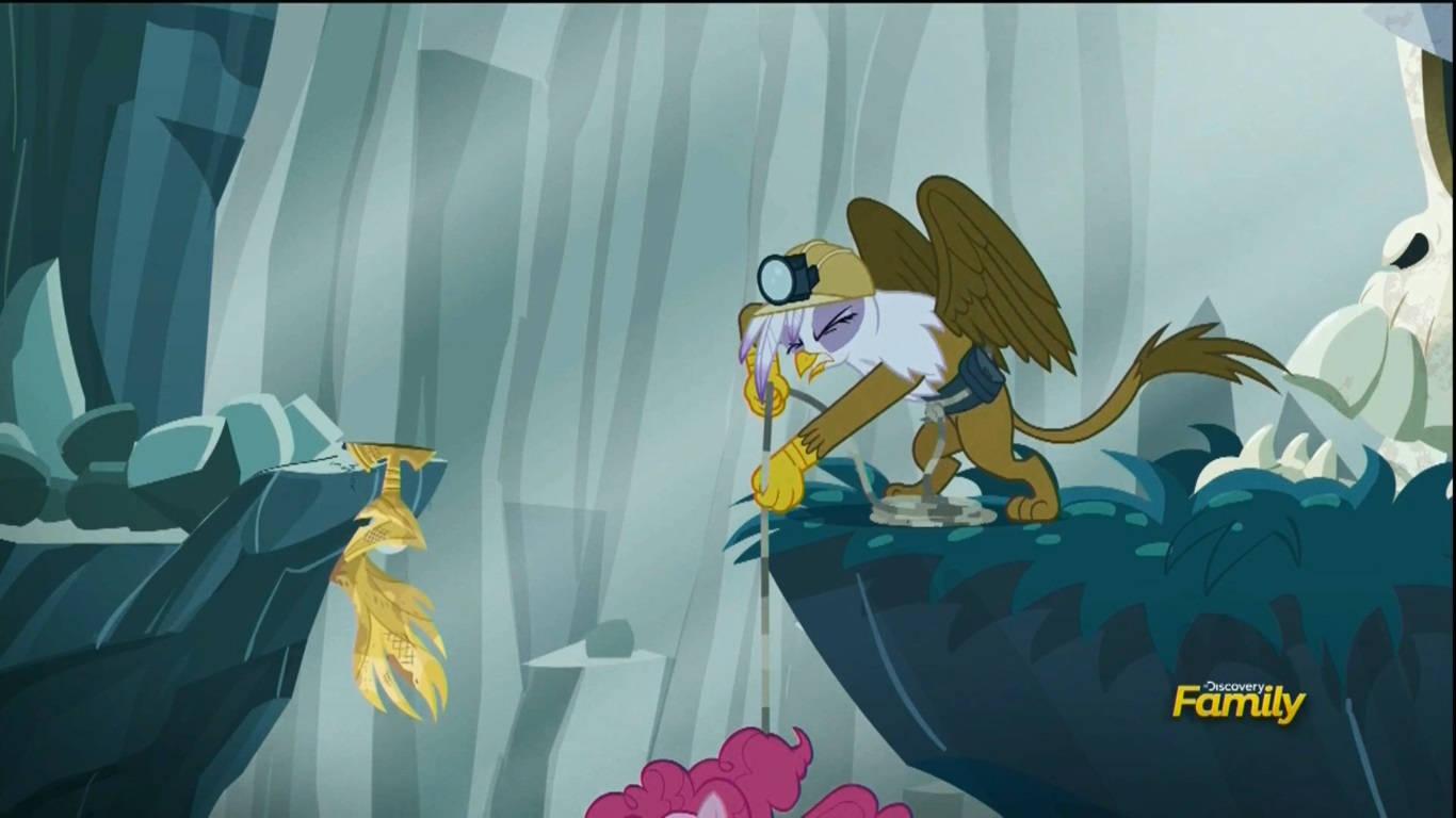 Pinkie Pie eventually finds her and tells her that she’s figured out what the Griffons need. Spoiler alert: It’s friendship. Rainbow Dash can’t really appreciate the news though due to her circumstances, and Pinkie eventually realizes that she MIGHT need a little help. She goes back to Gilda and prays on her emotions to guilt her into helping Rainbow Dash not die, and so the two of them head for the abyss again with a long length of rope. Shenanigans ensue (Pinkie proves time and again she doesn’t understand how to tie off a rope) and Pinkie and Rainbow Dash end up dangling off yet another cliff with Gilda being the only one to support them. Oddly enough, the Idol is RIGHT in front of her as are the remains of poor Arimaspi who must have cracked his skull on the way down and bled out in this cold and lonely canyon. I did NOT expect something that dark in this show! Gilda has to decide whether to go for the Idol which could bring back the pride of her people or save the two ponies who represent the friendship the Griffons (and herself) need as well. Guess what she picks.