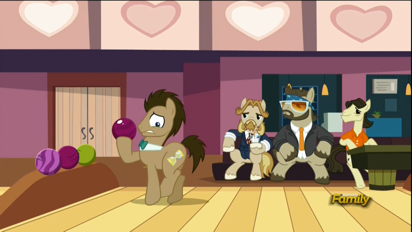 After parading Muffins through his lab for no discernible reason other than to set up a plot device for later (flameless fireworks that he can’t figure out how to ignite), he realizes that he needs to get his suit tailored for the wedding later today and just leaves Muffins twisting in the wind. Aww… What the hell dude? I thought you were the Doctor, not the Master! Anyway, he heads straight for Rarity’s boutique (because where the hell else would he go) but finds it closed for the time being. She’s probably doing something to save somepony through the power of friendship or whatever. I wonder how much business she loses whenever she’s out hunting dragons or being sent to reeducation camps. Fortunately for the time lord, Vinyl Scratch just happens to be walking by wearing her presumably magic headphones that don’t appear to be connected to any device and yet are still outputting some serious wubs. Despite not hearing a word the guy is saying (maybe she’s learned to read lips for just this scenario) she knows exactly what he’s looking for and takes him to the bowling alley. Confused at first, the Doctor quickly realizes why as the Big Lebowski ponies (told you we’d get back to 90s movies!) show up wearing FABULOUS suits. I distinctly remember them all wearing TERRIBLE clothes in that movie, but whatever. The Doctor finds out they make their own clothes and begs them to fix his suit, but they can’t because they’re busy with a bowling tournament.