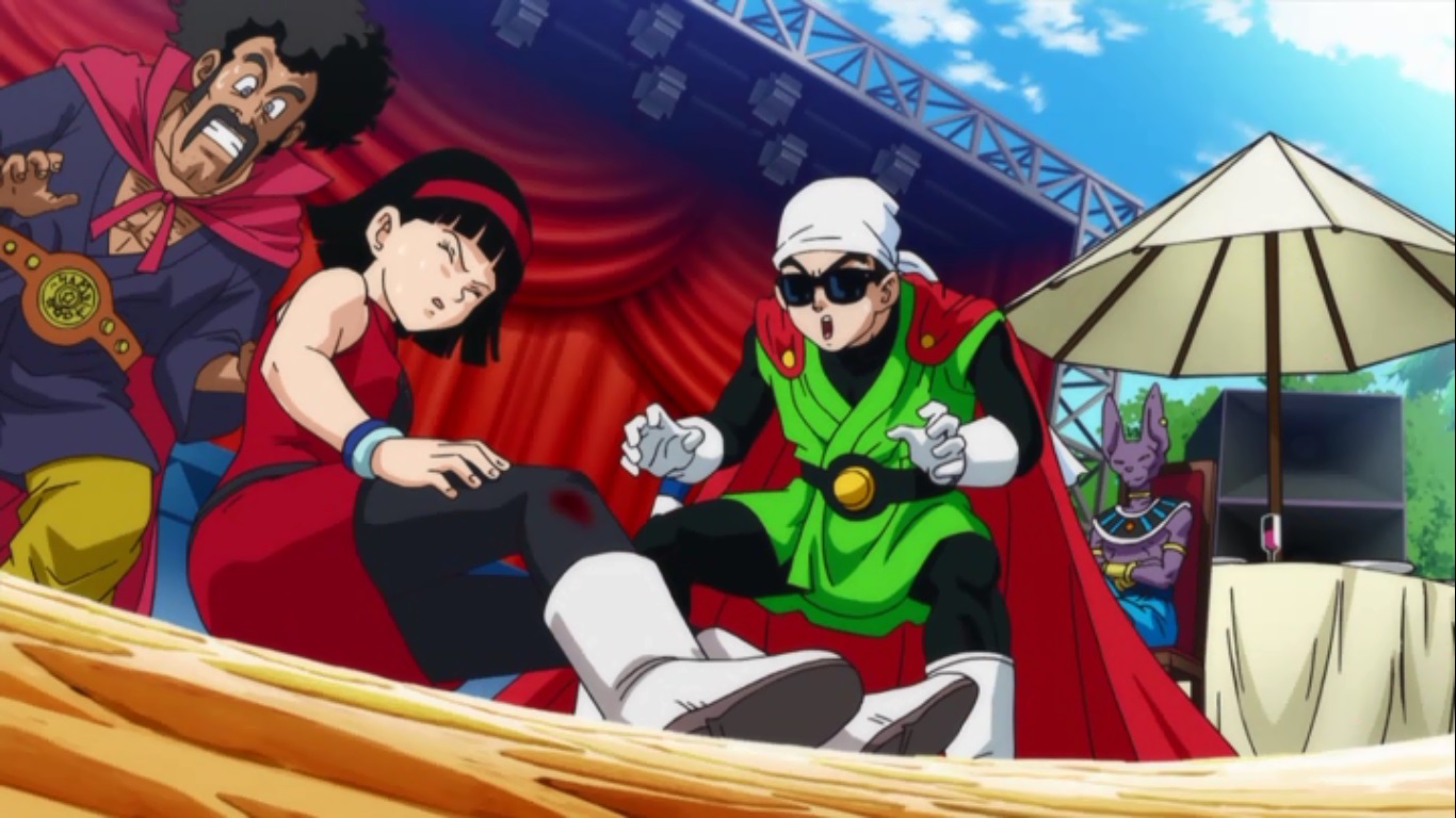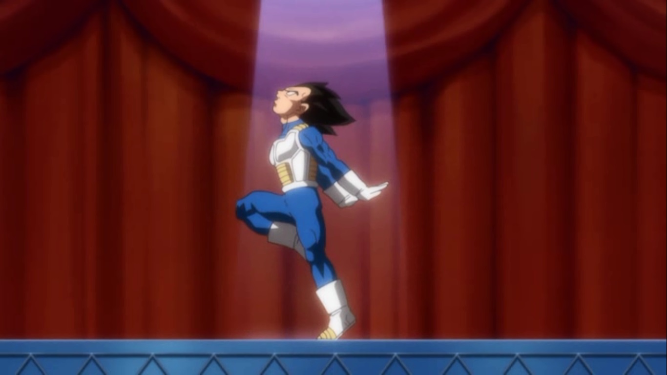 The only real purpose this bafflingly stupid scene apparently has is to confirm that Videl is pregnant at this point and hasn’t told Gohan yet. We find this out when the White Mage (Dende) heals Videl’s wound and senses that she’s bleeding out for two. There HAD to have been a better way to get this out there because Gohan playing dress up and pontificating at a gun wielding child is just embarrassing, obnoxious, and has started to get me to turn against this movie. It’s a shame because up until the Pilaf gang showed up, it was heading down a strong road. A good villain with various layers to him (he’s not out and out evil, but his detachment makes him dangerous) and some snappy writing on behalf of the script and the VERY strong translation. It’s too bad that the second act is getting dragged down in unfunny shenanigans. Even Beerus is getting pissed at all the foolishness going on before him and is about to destroy the planet because of it when Vegeta does the one thing he can to stop the madness. DANCE!!